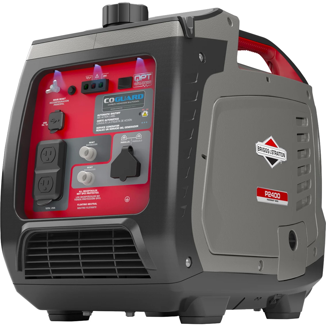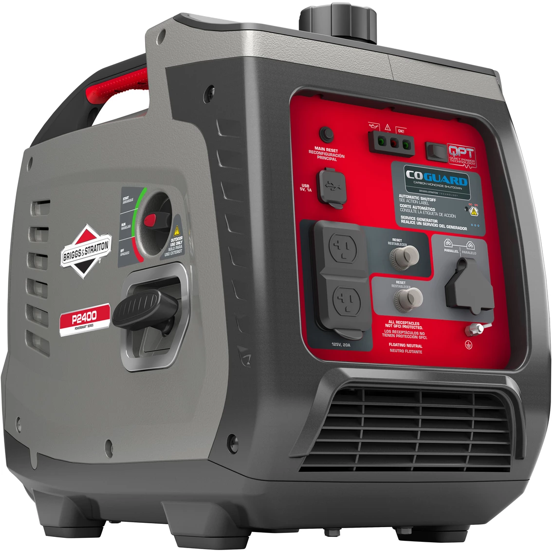 The Briggs & Stratton P2400 PowerSmart Series inverter generator provides the power you need for camping and recreation applications. A monitoring system features LED lights to alert low oil or overload. Two 120V, 20A outlets, a parallel port and USB ports allow you to stay connected and keep multiple items powered simultaneously. The lightweight, compact design offers easy transport and storage. For added protection, CO Guard carbon monoxide shutdown technology shuts down the generator if harmful levels of CO accumulate in the generator’s operating area. CA Compliant. For use in all 50 states. Model: 30758.