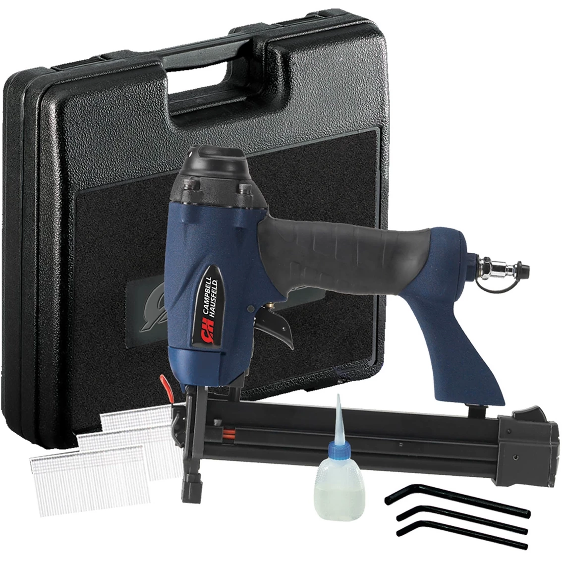 The Campbell Hausfeld 2-in-1 brad air nailer/air stapler drives both 18-gauge brad nails and 1/4-in. crown staples from lengths of 1/2-in. to 1 1/4-in. Get perfect results on multiple types of wood with the adjustable depth control. The quick-clear nose makes it fast and easy to remove nail jams to reduce downtime. A non-marring tip helps avoid denting the work surface. This brad air nailer/air stapler kit includes a 1 1/4-in. brad air nailer /1/4-in. crown air stapler, 1-in. brad nails (1,000 pieces), 1-in. staples (1,000 pc.), 1/4-in. industrial plug – 1/4-in. NPT, Allen wrenches (2), bottle of air nailer oil and high-impact carry case. Rubber comfort grip offers optimum ease of use while the quick-clear nose makes it fast and easy to remove nail jams to reduce downtime. Finish your projects faster and easier with Campbell Hausfeld – The Air Power Expert. Model: CHN10499AV.