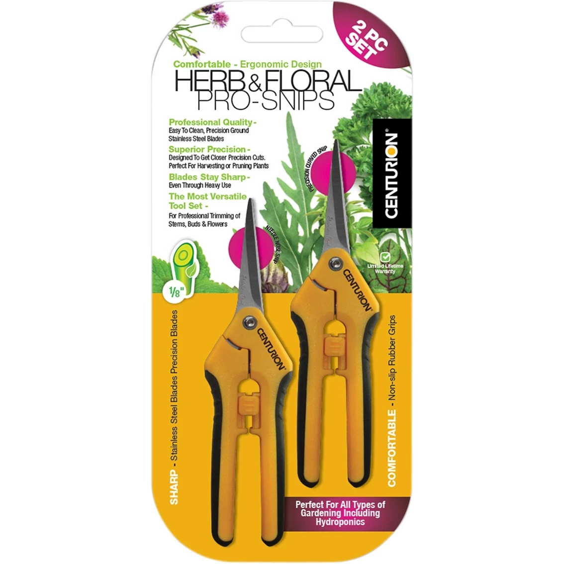 With the Centurion 2 Piece Snip Set , these precision floral snips give you extra precision and control perfect for trimming in tight and close quarters. Both snips allow users to fine-tune their plants effectively without sacrificing blade size. The rust-resistant stainless steel construction provides long-lasting durability and is easy to clean and sterilize, even with heavy use. The convenient spring loaded handle design enhances speed, performance and makes cutting easier. Model: 201.