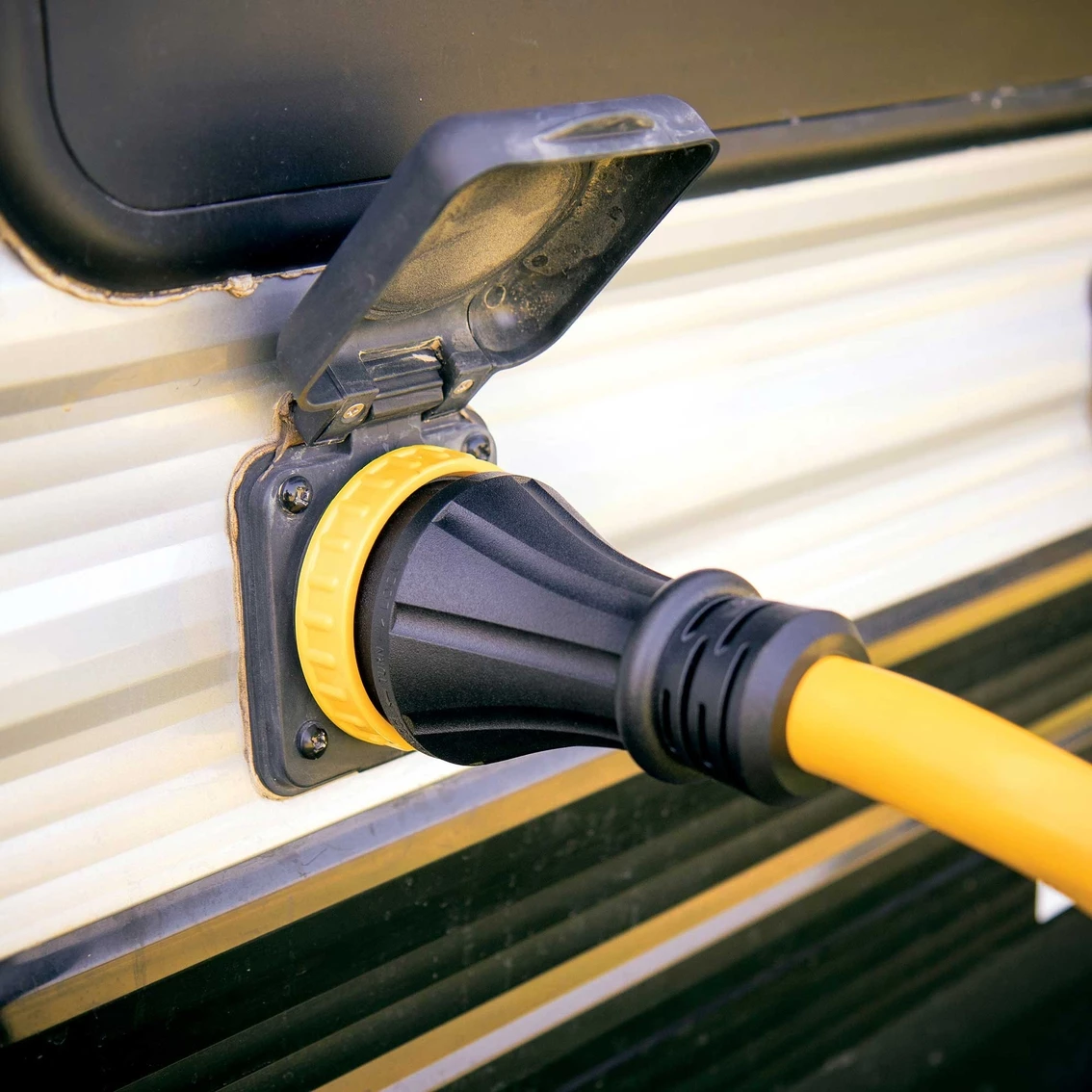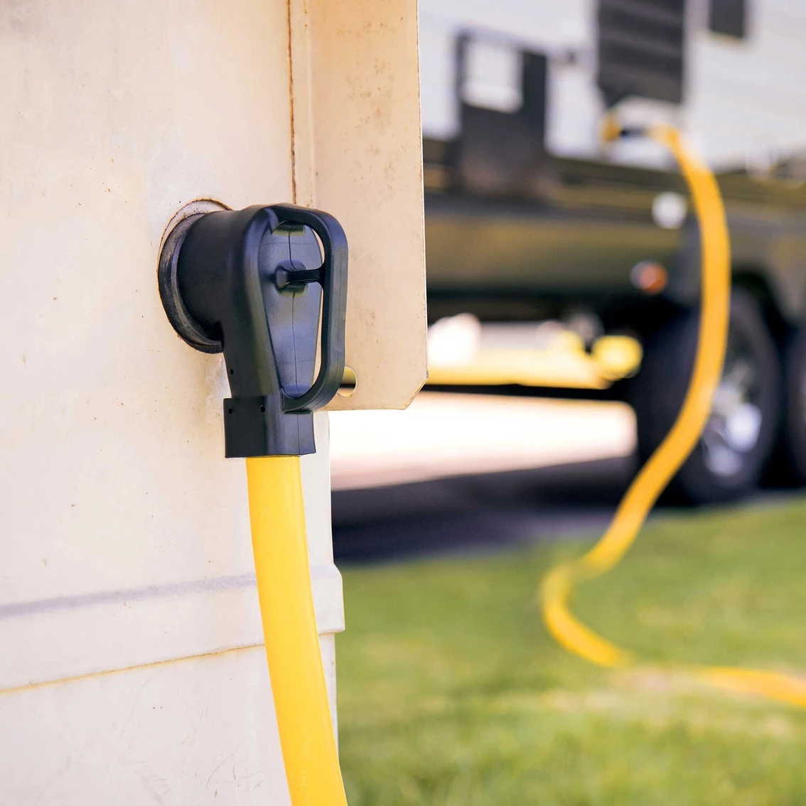 Easily insert or remove your cord thanks to the 90-degree design and the large, contoured grip. Ensure a secure connection every time you plug it in since the receptacle connector includes a locking ring which quickly locks the cord to the RV inlet in only 1/8 of a turn.