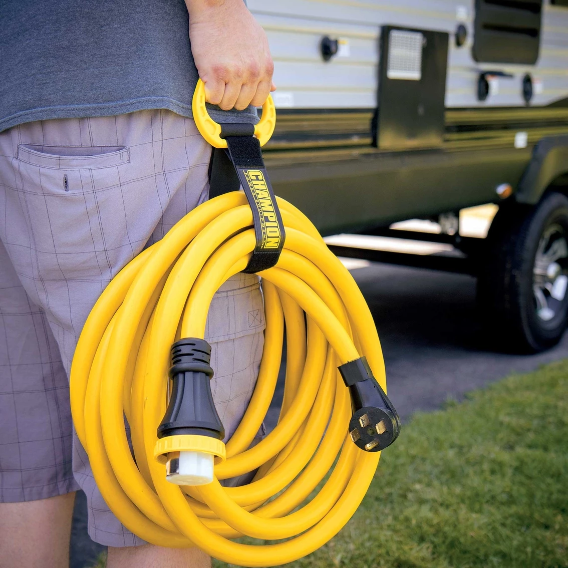 Championβs heavy duty power cord is built to last and can be depended upon to provide the power you need whether youβre traveling the country in your RV or enjoying a quick weekend getaway. Plug one end of the cord into your RV, and then plug the other end into the shore power at your campground, your generatorβs 50-Amp outlet, or a Champion 50-Amp parallel kit.