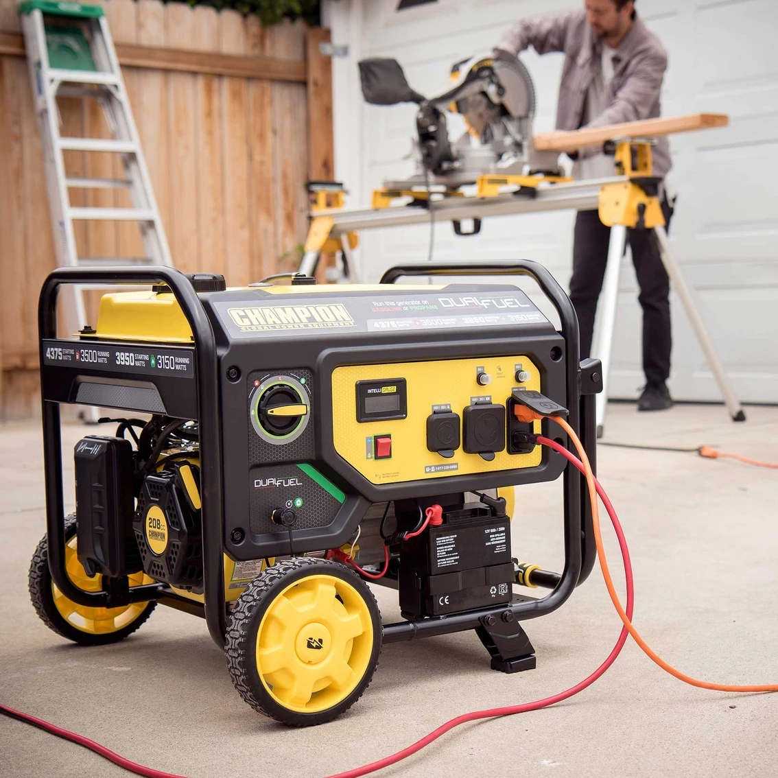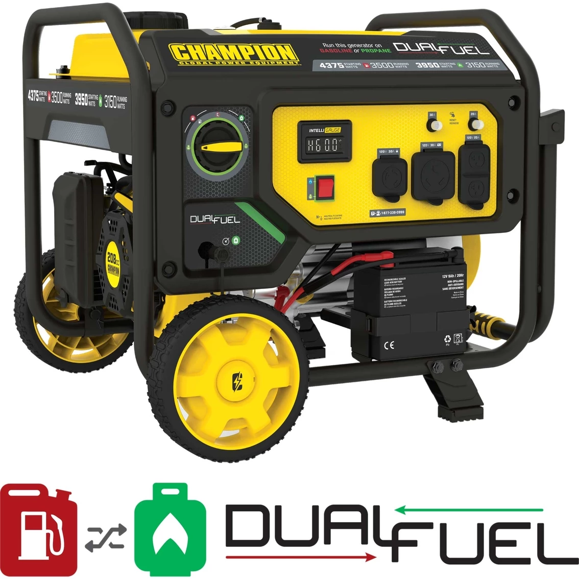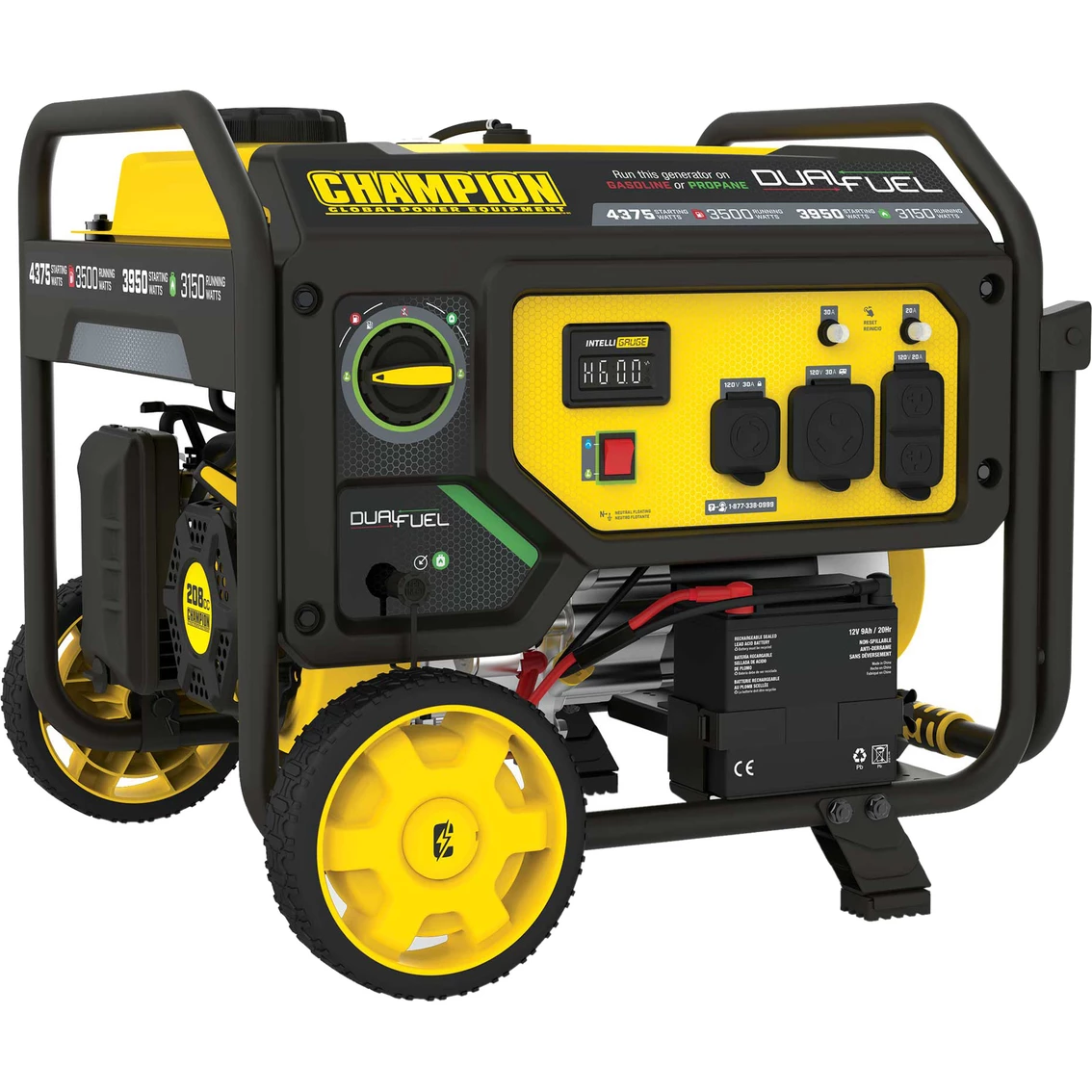 Using gasoline, the 208cc Champion engine produces 4375 starting watts and 3500 running watts, and will run for 14 hours at 50% load when the 4.7-gallon fuel tank is full. It produces 3950 starting watts and 3150 running watts, and will run for 10.5 hours at 50% load when using a 20-pound propane tank. Also included is a 6.5-foot propane hose with a built-in regulator.