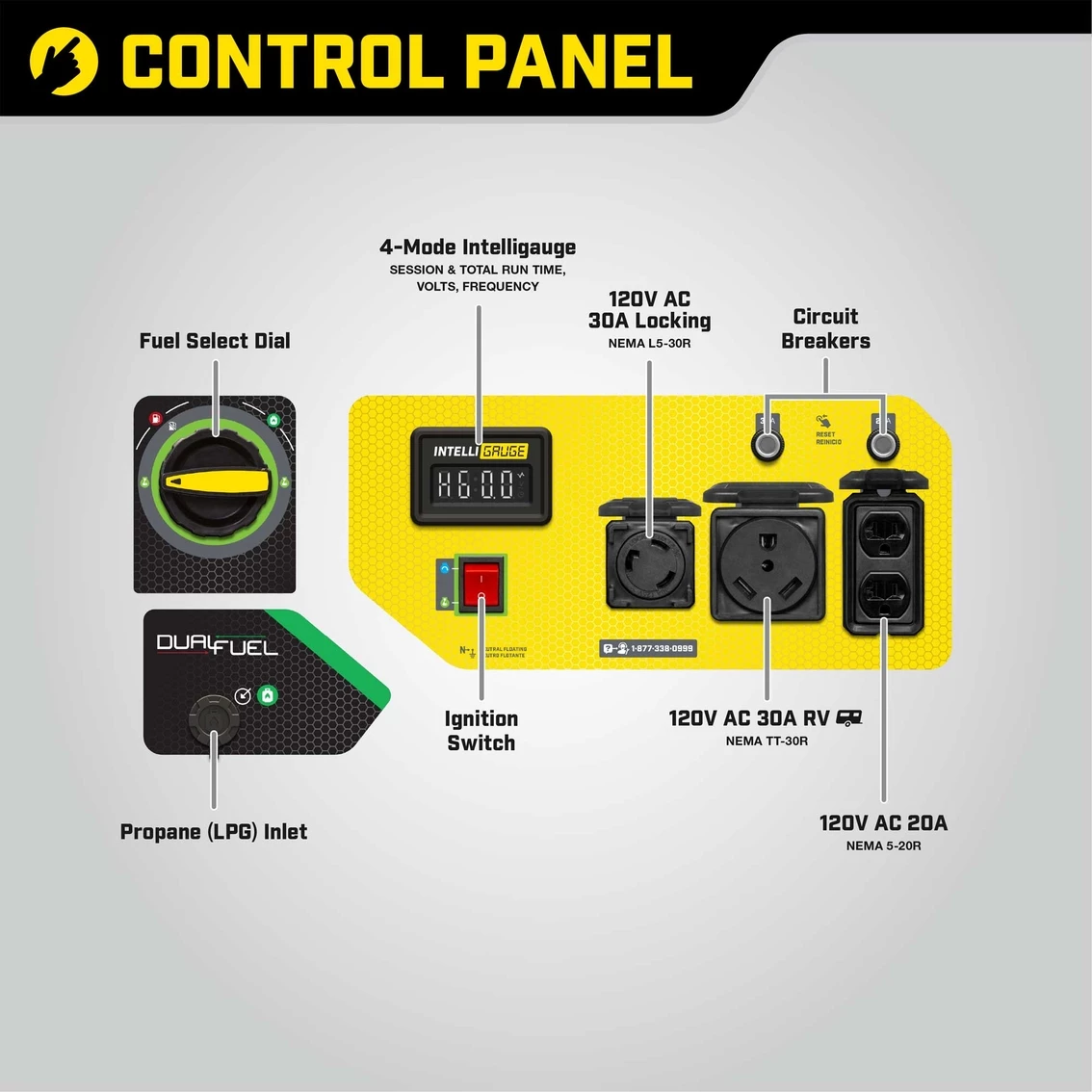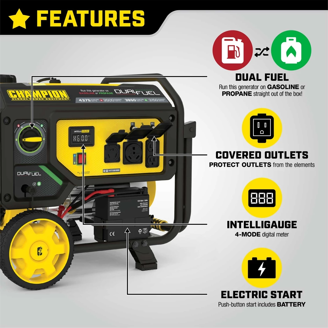Operate your Dual-Fuel generator right out of the box on gasoline or propane, and easily switch fuels with our patented fuel select dial that allows for safe switching between fuel sources.