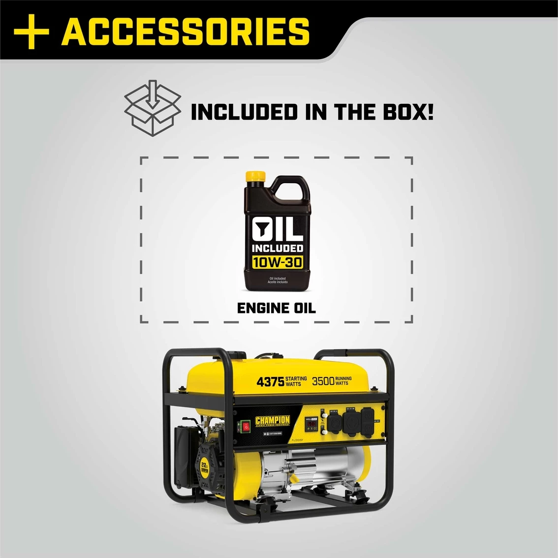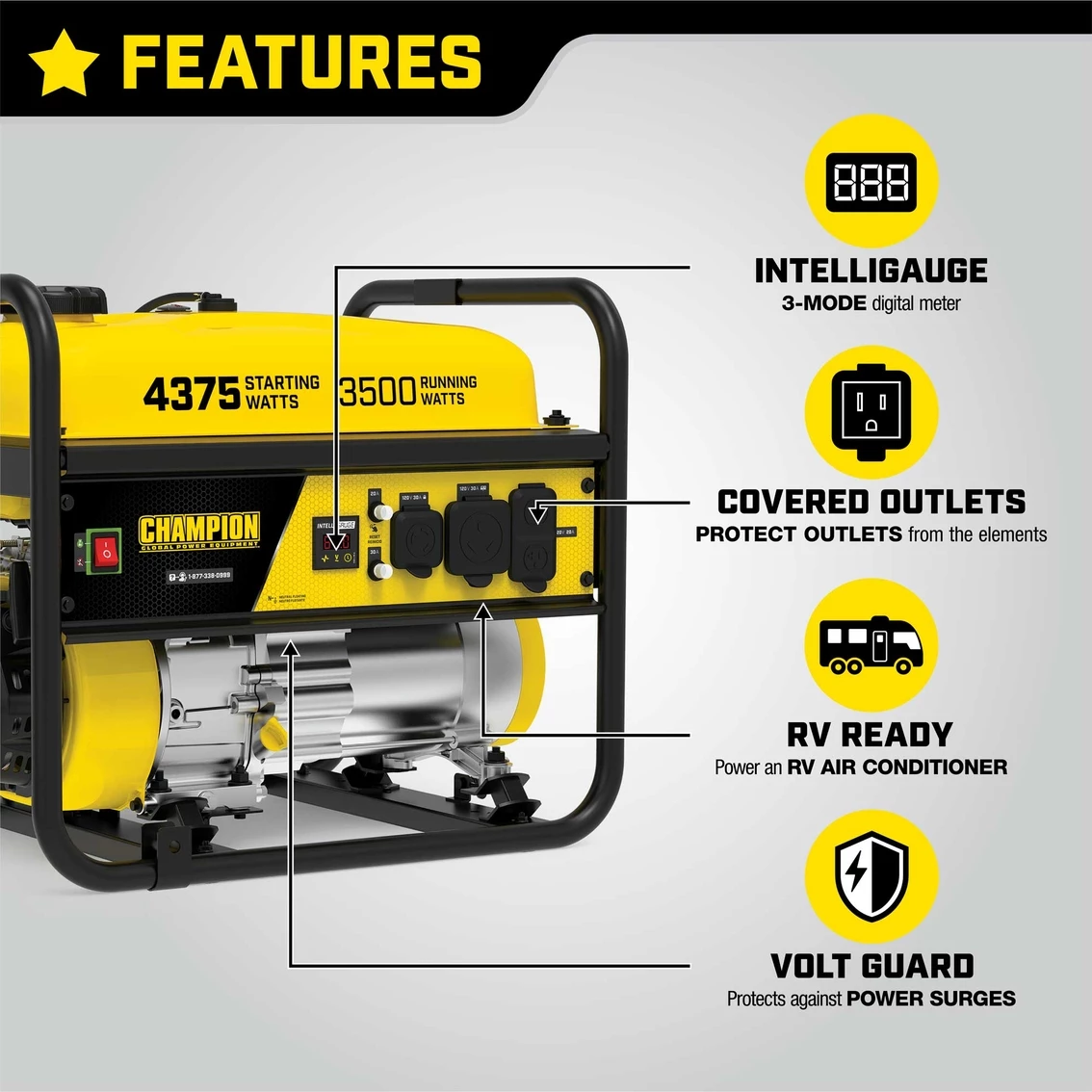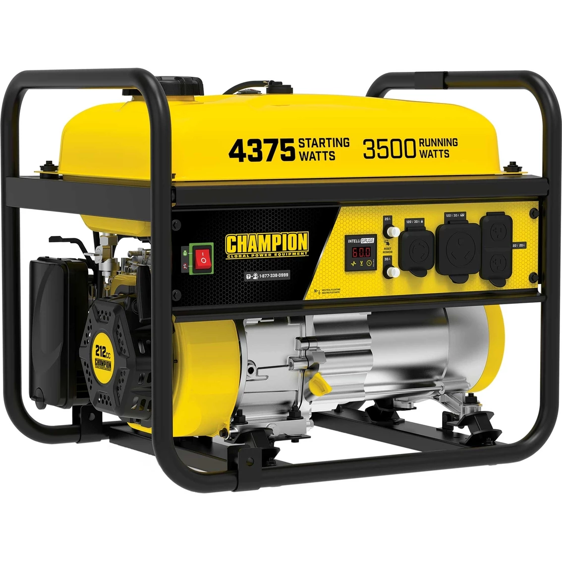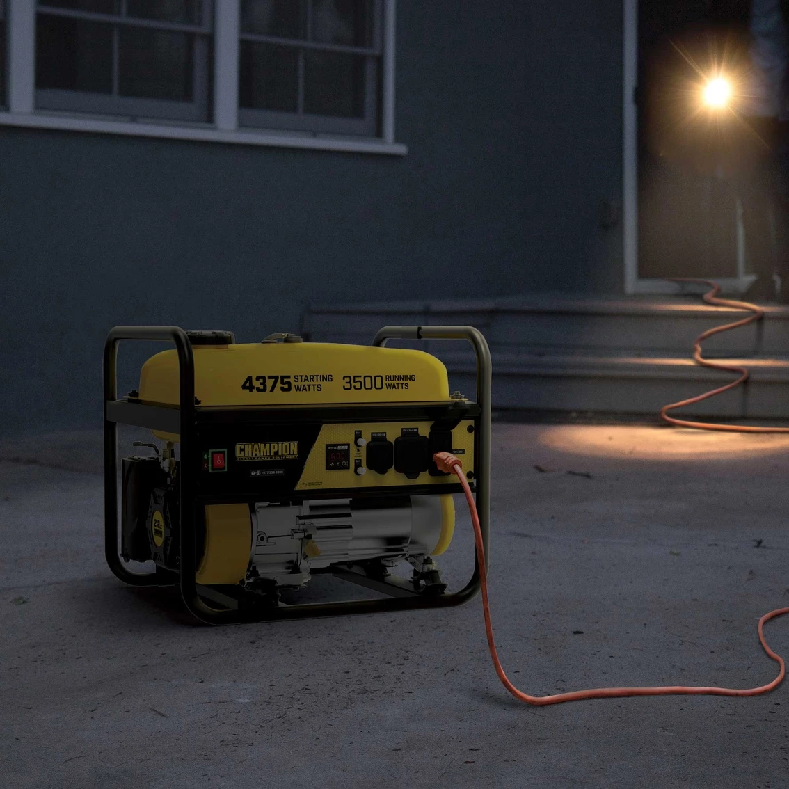 The reliable 212cc single-cylinder OHV Champion engine produces 4375 starting watts and 3500 running watts, and will run for up to 14 hours at 50% load when the 4.7-gallon tank of gasoline is full.