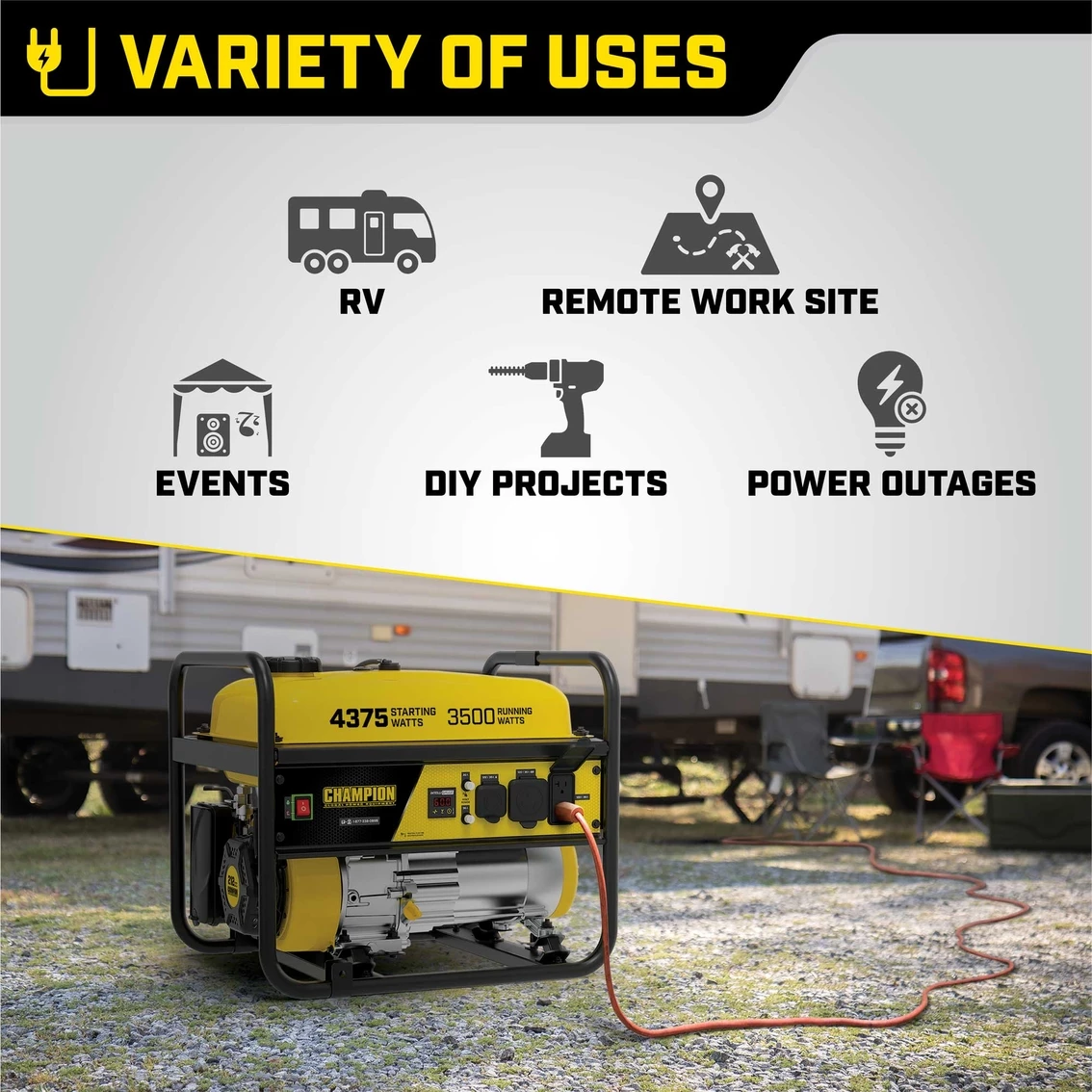 The Champion Power Equipment 200963 3500-Watt RV Ready Portable Generator is the perfect combination of versatility and convenience. A powerful companion for your next camping trip or weekend project, this generator can also provide plenty of backup power for your essentials during an outage. For your RV, you’ll enjoy enough power to start and run a 15,000 BTU RV air conditioner.