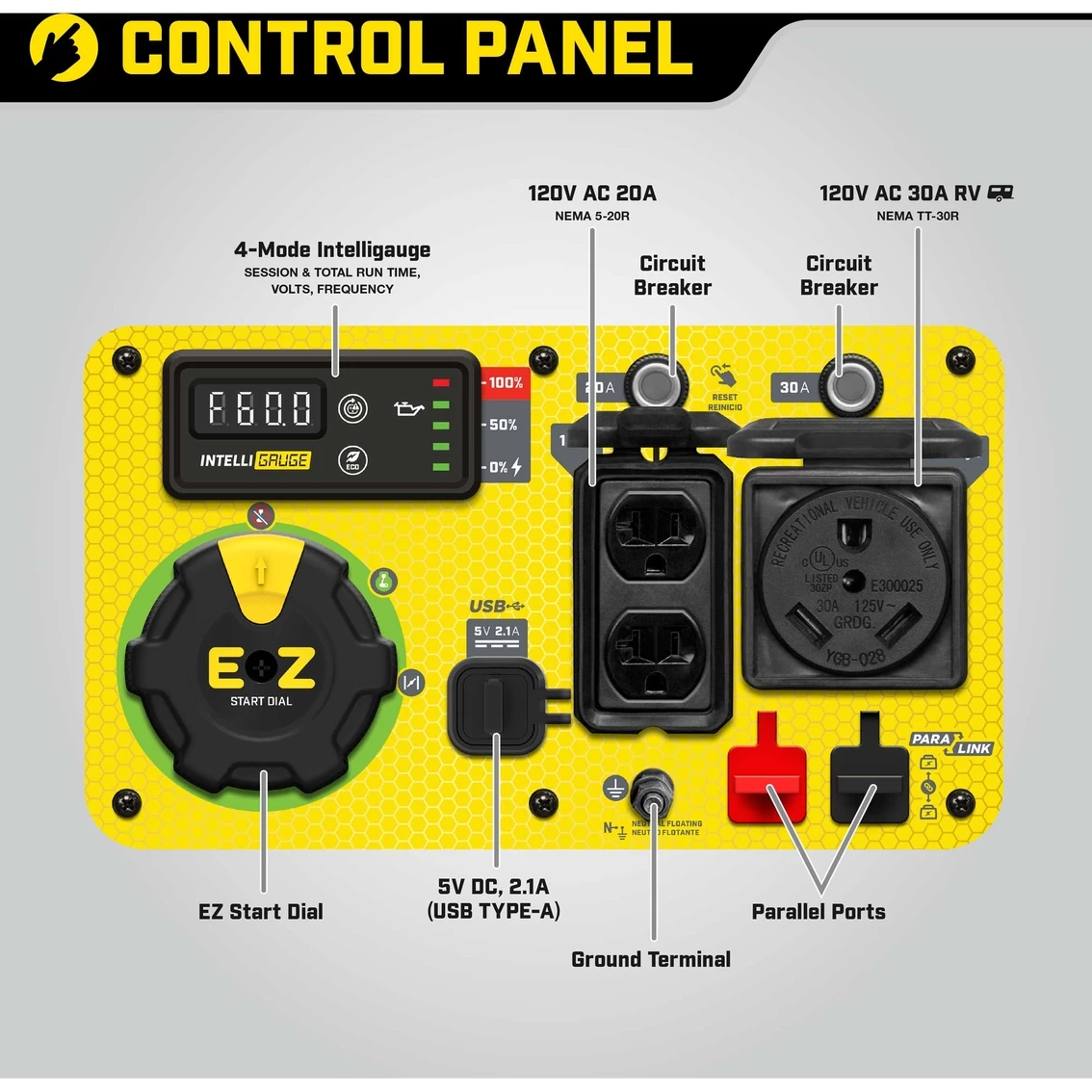Champion’s EZ Start Dial makes getting started quick and easy. Featuring Cold Start Technology, Extended Run Time, and an easy to read fuel gauge, the reliable 212cc Champion engine produces 4500 starting watts and 3500 running watts, and runs for 14 hours at 25% load when the 2.25-gallon fuel tank is full.