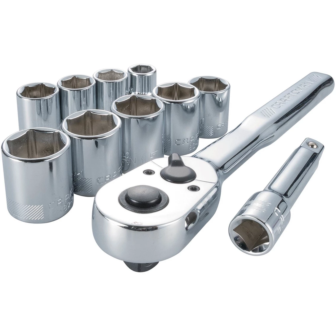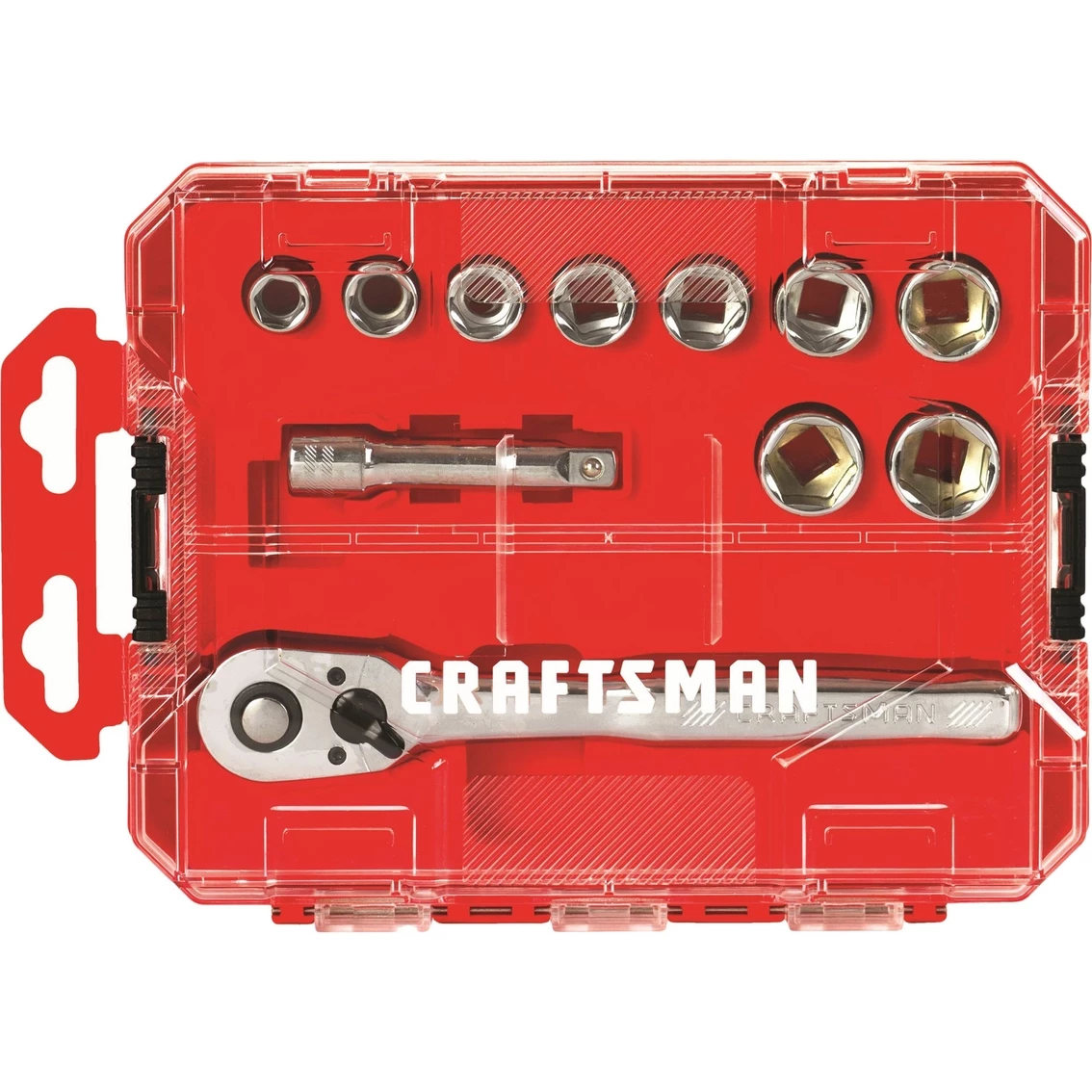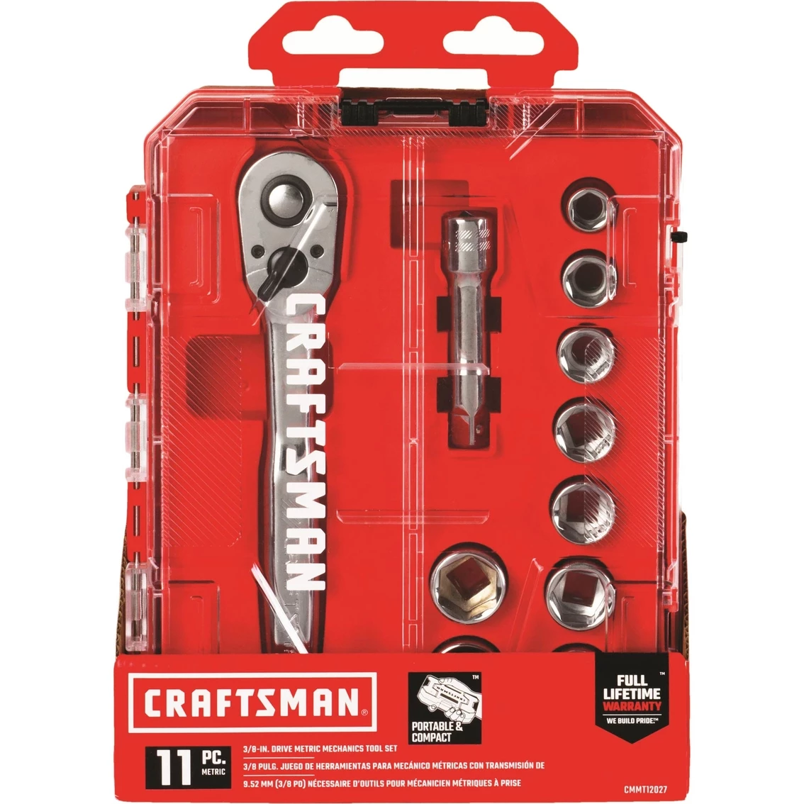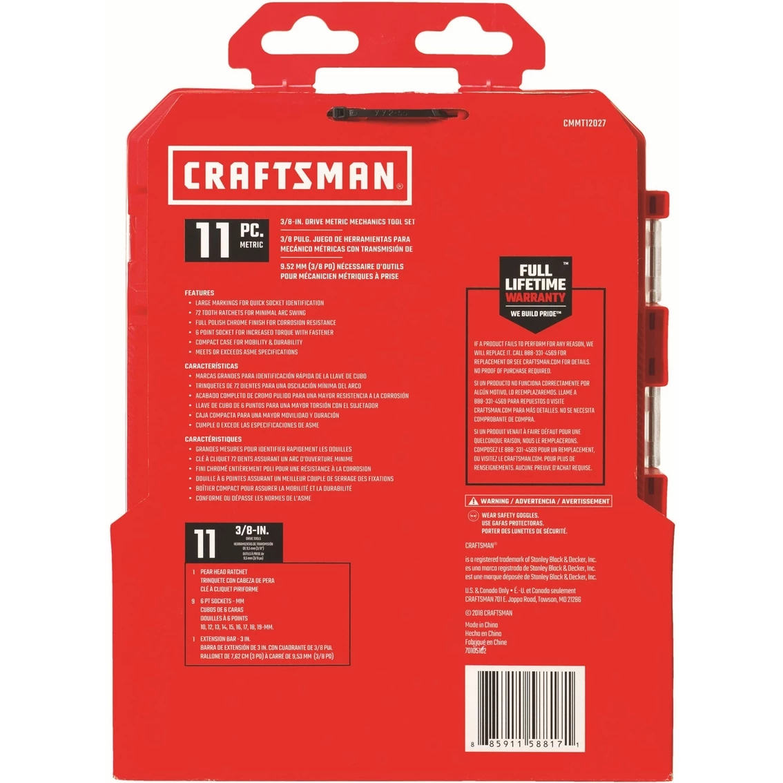 This Craftsman 11 pc. 3/8 in. Drive Metric Shallow Socket Set has Large Markings for quick socket identification, 6-point socket and Craftsman lifetime warranty.