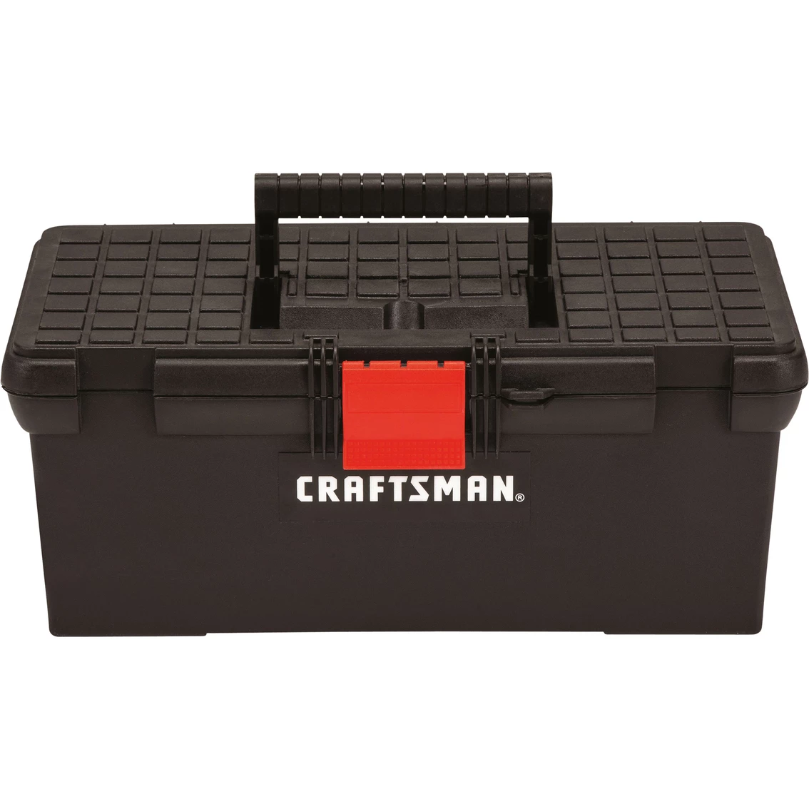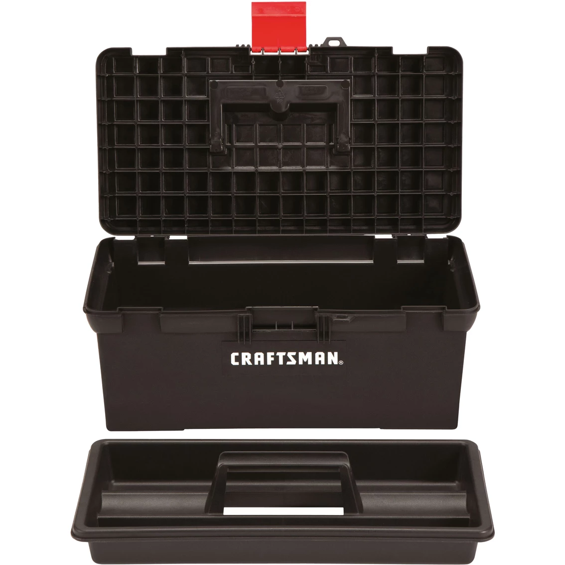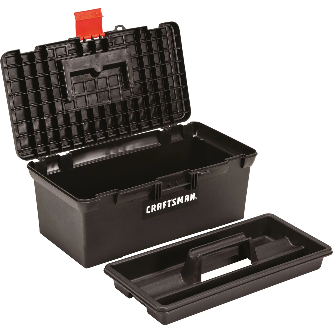 Keep your supplies neat, organized and in one central location for easy access with this Craftsman 16 in. Plastic Lockable Tool Box. It’s made of a sturdy material and comes pad lock ready, sold separately, for added safety. This plastic tool box has a spacious interior that you can use to hold a hammer, measuring tape, screwdrivers, a wrench and more. It also includes a removable tray that’s suitable for holding smaller handheld tools, screws, nuts and bolts and nails. Model: CMST16005.
