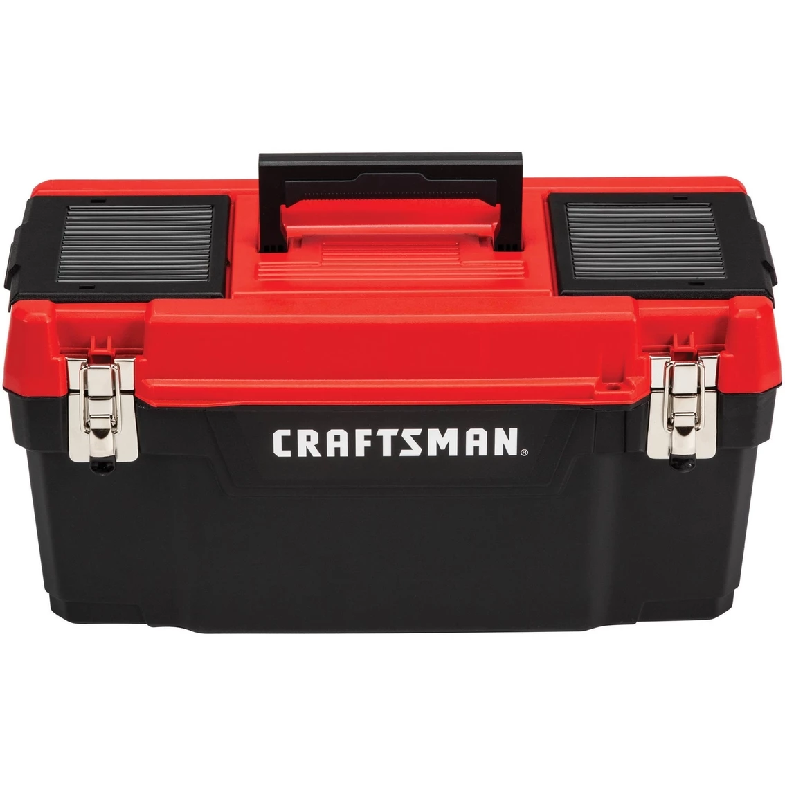 Keep your supplies neat, organized and in one central location for easy access with this Craftsman 20 in. Toolbox. It’s made of a sturdy material and comes padlock ready, sold separately, for added safety. This plastic tool box has a spacious interior that you can use to hold a hammer, measuring tape, screwdrivers, a wrench and more. It also includes two top organizers and a removable tray that’s suitable for holding smaller handheld tools, screws, nuts and bolts and nails. Model: CMST20901.