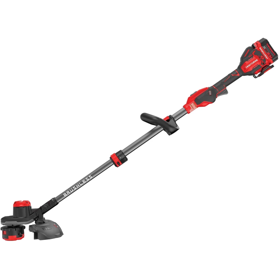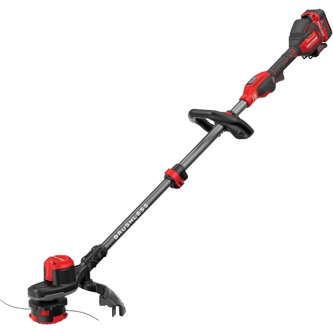 Keep your outdoor space magazine perfect with this Craftsman 20V MAX 13 in. String Trimmer. Extended run time brushless motor with a 4. 0 Ah battery pack and two speed setting lets you choose more power or more run time. Ergonomic adjustable length pole fits your height. Quick Wind spool system provides ease of 0.080-in. twisted line replacement. Bump feed 13-in. cutting swath allows for added efficiency. Hanging hook is an integrated part of the tool ready for use with the VERSATRACK Wall Organization System right out of the box. Includes V20 MAX 4. 0 Ah lithium ion battery, V20 MAX lithium ion charger, 0.080-in line prewound in spool auxiliary handle and guard. V20 MAX battery maximum initial battery voltage measured without a workload is 20 volts, nominal voltage is 18.