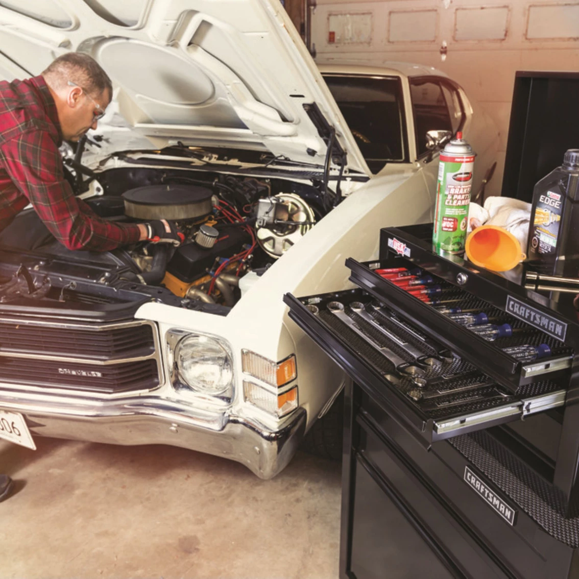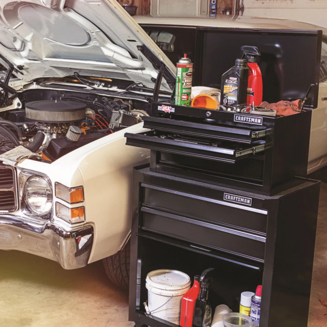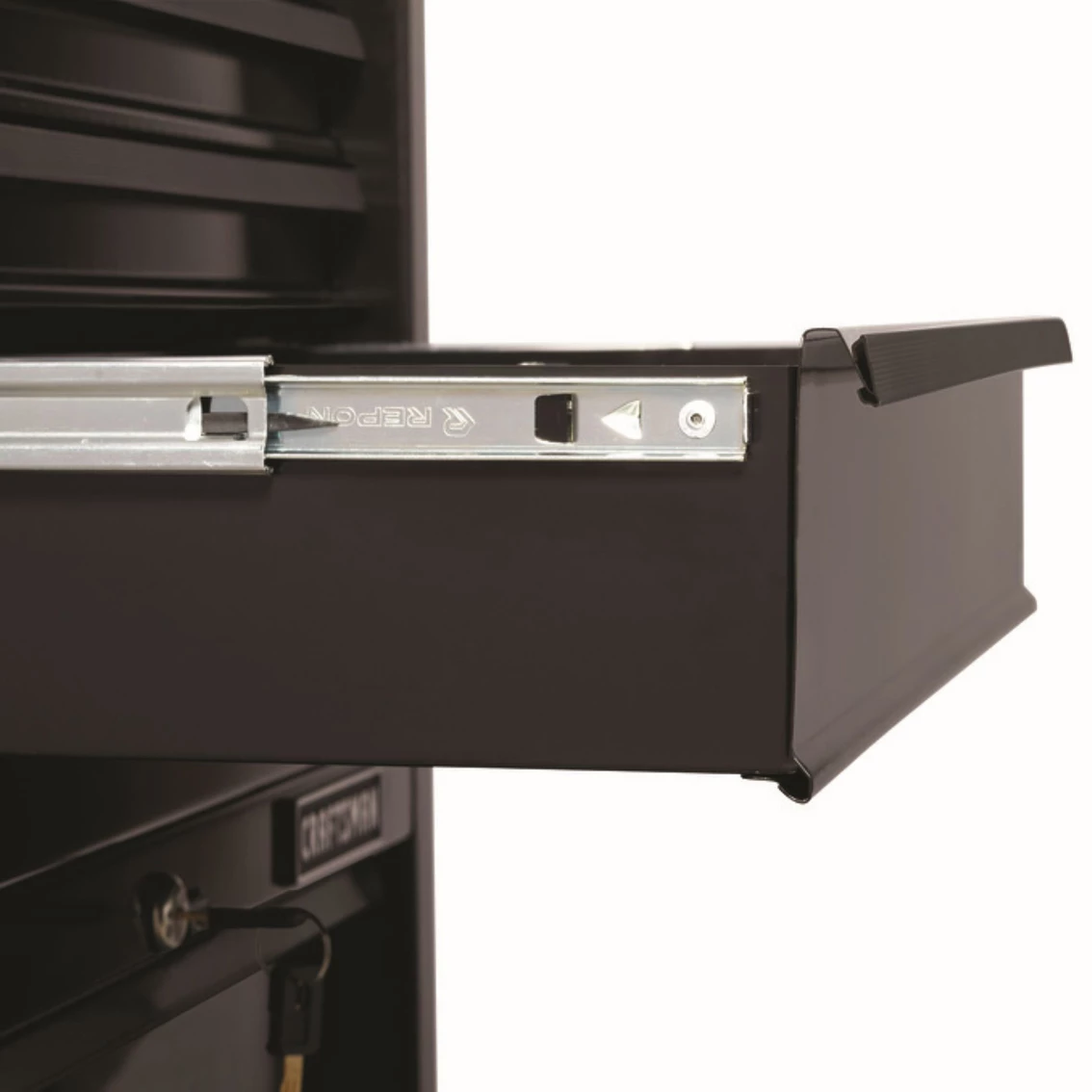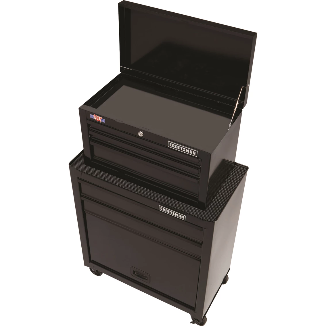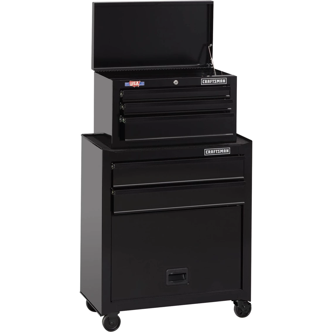 This Craftsman 5-drawer tool chest with a rolling cabinet is an ideal storage method to help organize your garage. This two-piece tool storage combination has a 300-lb. load rating and moves smoothly on 3 in. x 1 in. casters. Each drawer glides smoothly on ball-bearing slides and supports 30 lbs. of tools. Plus, large power tools and supplies can be tucked away in an open storage space that is neatly covered by a lift-up panel. A keyed locking system safeguards the contents of the tool chest. Model: CMST22653BK.