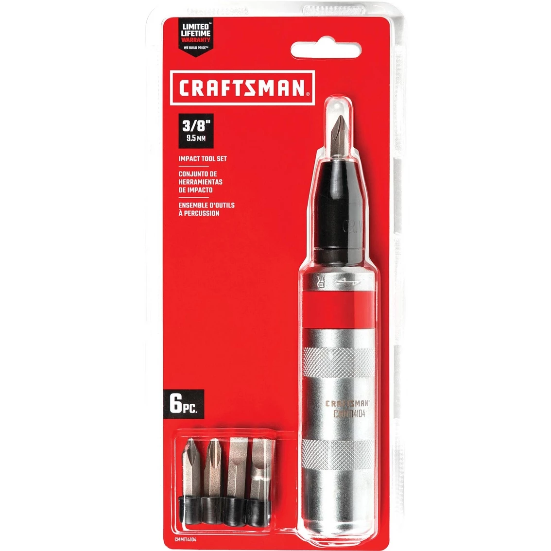Designed to convert the force of a hammer blow into 200 ft.-lb. of torque, the Craftsman Impact Tool Set loosens frozen fasteners quickly and easily. By using the included bit set, it can be used to both loosen and tighten Philips and slotted fasteners, as well as drive 3/8-in. sockets.