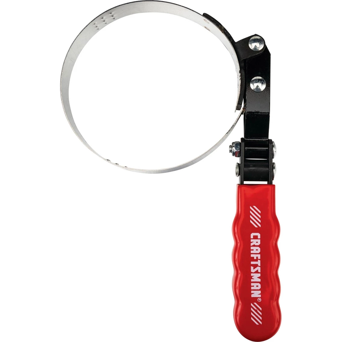 This Craftsman 3 3/4 to 4 3/8 in. Oil Filter Wrench has a comfort grip handle allowing the user to pivot for access in those hard-to-reach filters. Swivel tension adjusts easily on the handle. Unique yoke and link assembly provides firm grip without crushing filter. The auto-adjusting steel band is dimpled for extra gripping power.
