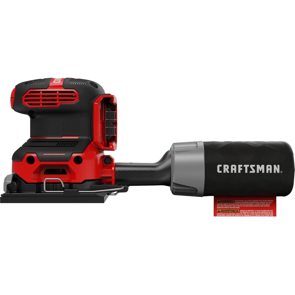 Sand between coats of paint or finish with this V20* Cordless 1/4 Sheet Sander from Craftsman. The sander comes with a powerful motor that delivers pro-grade sanding power and removal rates with its small surface. With a high-output dust collection system, you can control dust accumulation through the dust bag or use the 1.25-in. vacuum connection. Its lightweight, low-profile design offers comfortable use while Versatrack compatibility means you can stay organized by hanging the tool back up when work is complete.