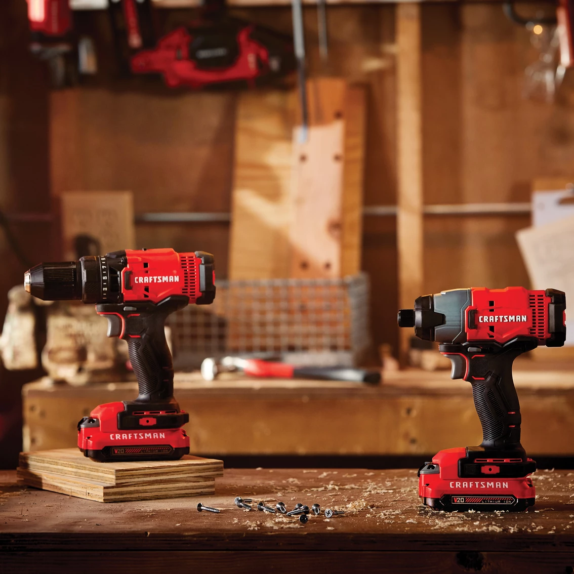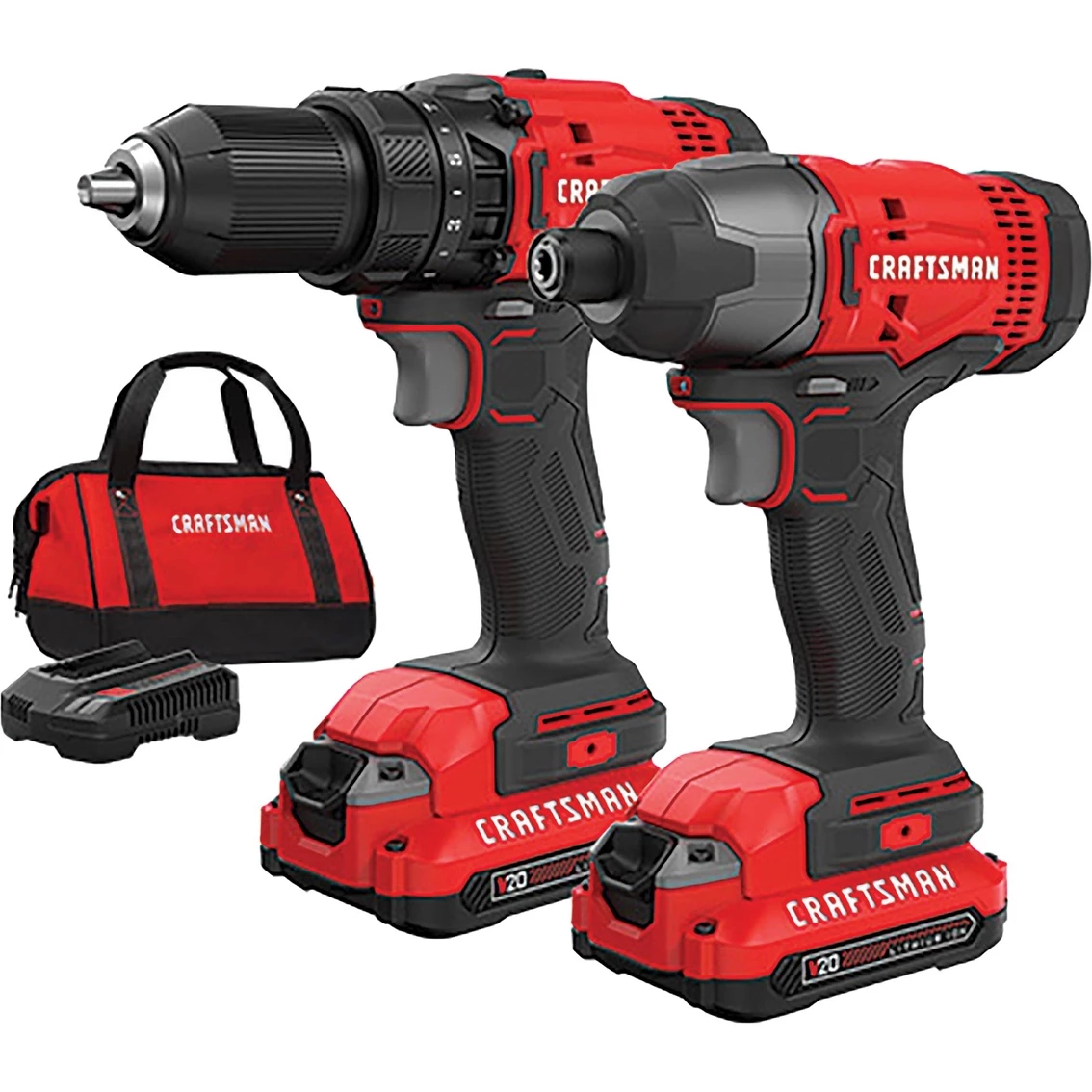 This Craftsman V20 20V MAX 2-Tool Combo Kit provides a solution for your drilling and fastening needs. The 2-speed Drill Driver has a 1/2 in. chuck to fit a variety of drill bits for different applications. Both units are lightweight, compact, and have comfortable overmolded grips. The 2-Tool Combo Kit comes with a soft storage. Model: CMCK200C2.