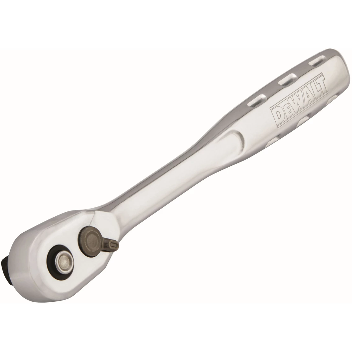 This 1/2 in Quick-Release Ratchet from DeWalt has a 5-degree arc swing making it easy to maneuver in restricted areas. The quick-release mechanism assures positive lock on sockets. Contoured, ergonomically designed handle with anti-slip grooves helps make this ratchet comfortable to use and provides added control.