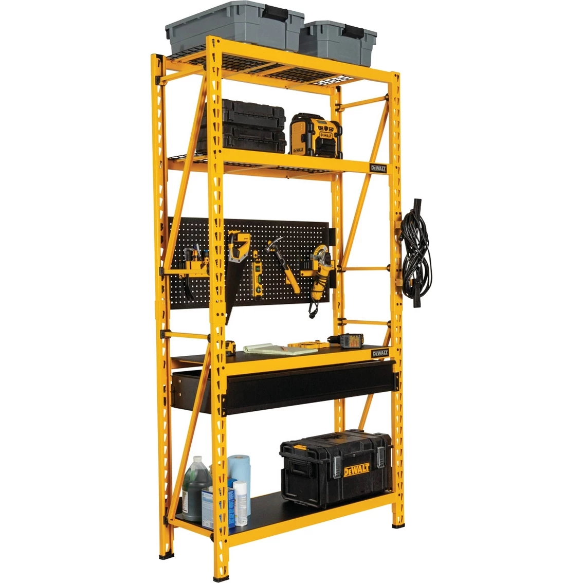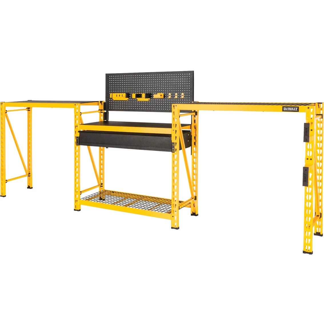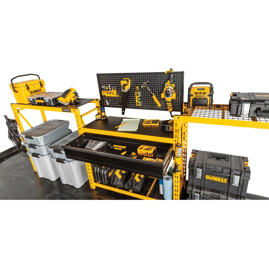 The DeWalt DXST6000WB Double Stack 4 ft. Work Bench Kit contains everything you need to create the ultimate customizable storage and work station. Featuring a durable steel frame given an industrial grade powder-coating, this kit contains two MDF composite and two wire grid shelves that are each rated to support up to 1,500-pounds of evenly distributed tools and equipment for a total capacity of 6,000-pounds. With no set arrangement, you are free to construct a completely custom setup unique to your own needs. In addition to four shelves, this kit includes an under-shelf storage drawer whose capacious interior is able to hold up to 120-pounds of tools and opens easily on smooth gliding ball-bearing rails. The steel pegboard can be mounted to either directly to the uprights in a stacked-rack configuration or on its own vertical supports in a horizontal shelf setup and the kit includes six tool holders to help organize and store your most often needed tools within easy reach. The included cord minder gives you a convenient place to store often needed extension cords and the spring-loaded end plates rotate, locking every 90-degrees, for vertical or horizontal cable storage and easy cord removal. Locking pins secure shelf crossbeams and mounted accessories in place and the kit includes two wall mounts to prevent the unit from accidentally tipping in any configuration keeping you safe. Model: 41609.