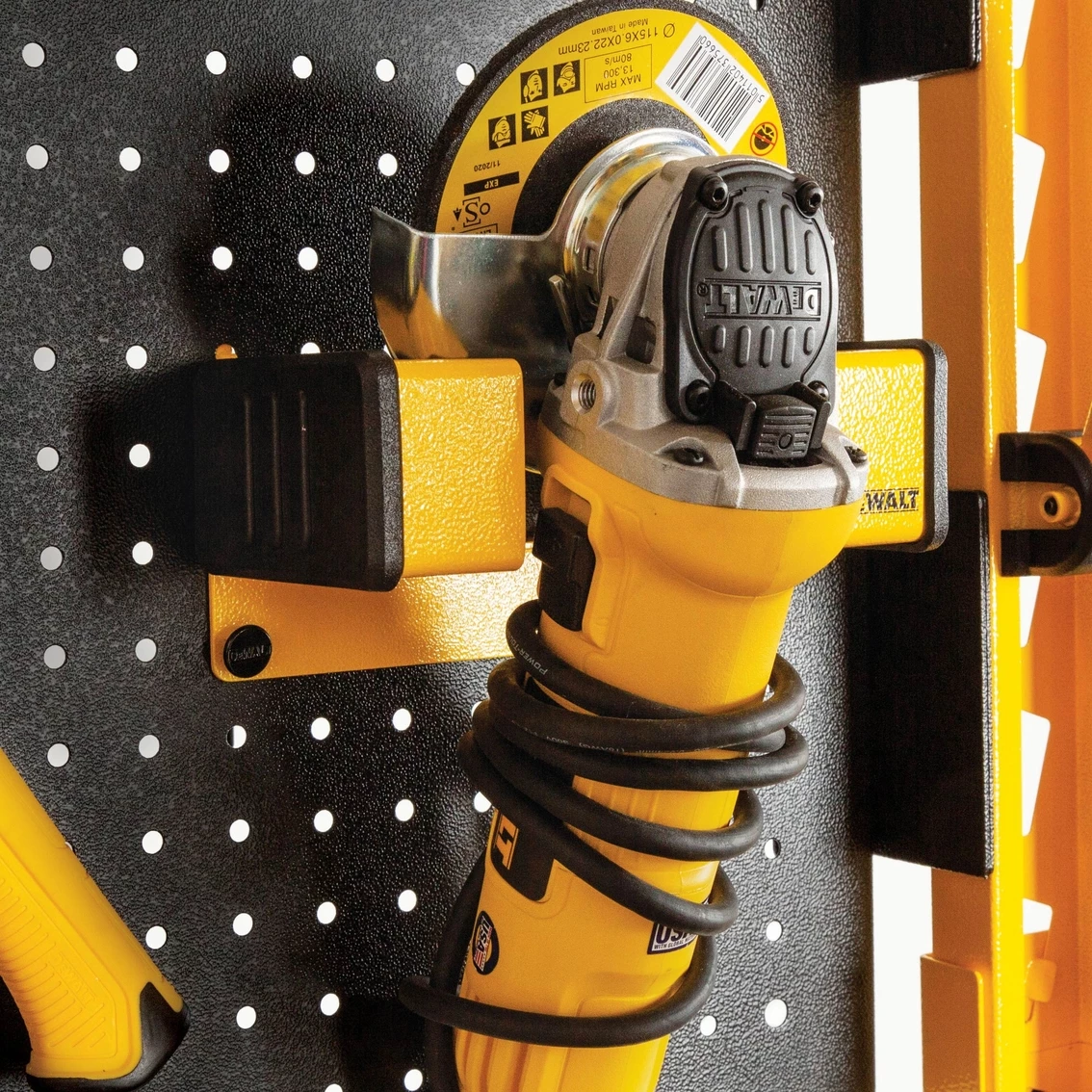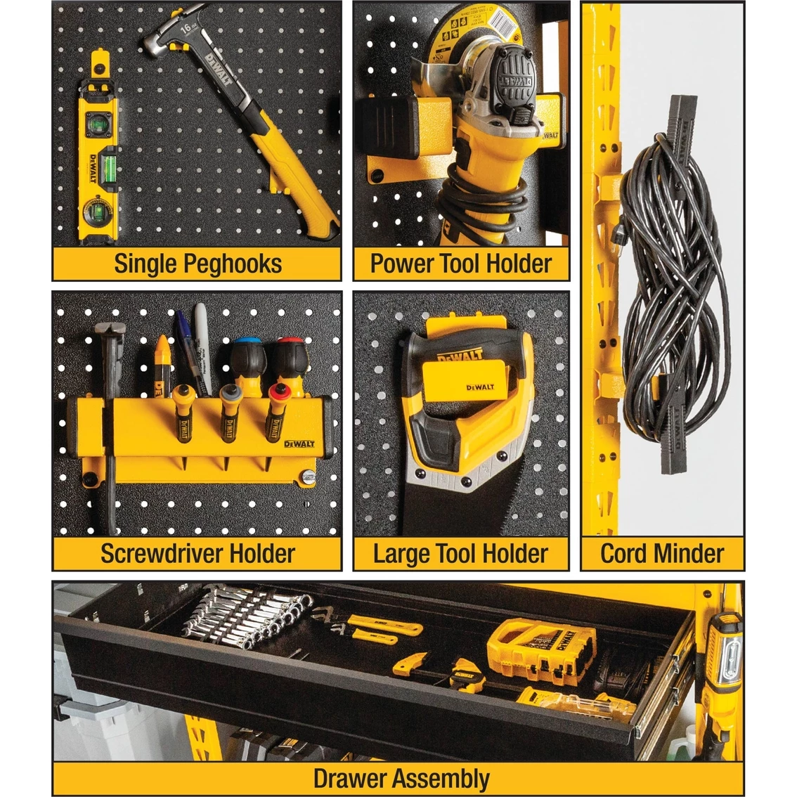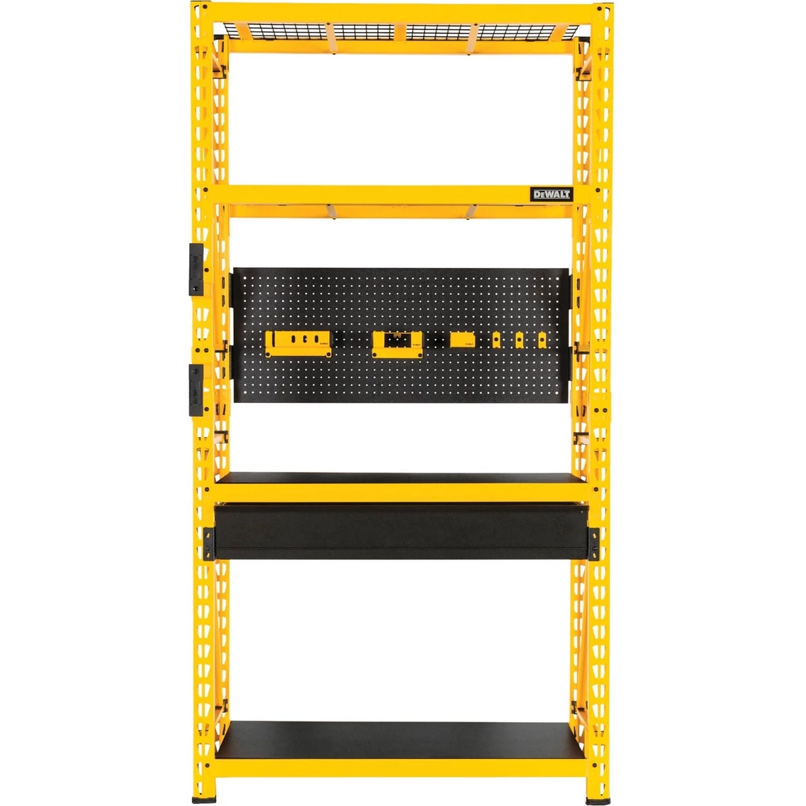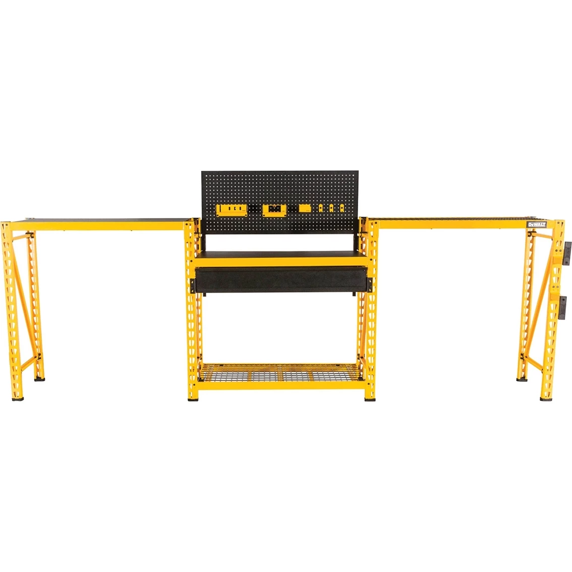 The DeWalt DXST6000WB Double Stack 4 ft. Work Bench Kit contains everything you need to create the ultimate customizable storage and work station. Featuring a durable steel frame given an industrial grade powder-coating, this kit contains two MDF composite and two wire grid shelves that are each rated to support up to 1,500-pounds of evenly distributed tools and equipment for a total capacity of 6,000-pounds. With no set arrangement, you are free to construct a completely custom setup unique to your own needs. In addition to four shelves, this kit includes an under-shelf storage drawer whose capacious interior is able to hold up to 120-pounds of tools and opens easily on smooth gliding ball-bearing rails. The steel pegboard can be mounted to either directly to the uprights in a stacked-rack configuration or on its own vertical supports in a horizontal shelf setup and the kit includes six tool holders to help organize and store your most often needed tools within easy reach. The included cord minder gives you a convenient place to store often needed extension cords and the spring-loaded end plates rotate, locking every 90-degrees, for vertical or horizontal cable storage and easy cord removal. Locking pins secure shelf crossbeams and mounted accessories in place and the kit includes two wall mounts to prevent the unit from accidentally tipping in any configuration keeping you safe. Model: 41609.