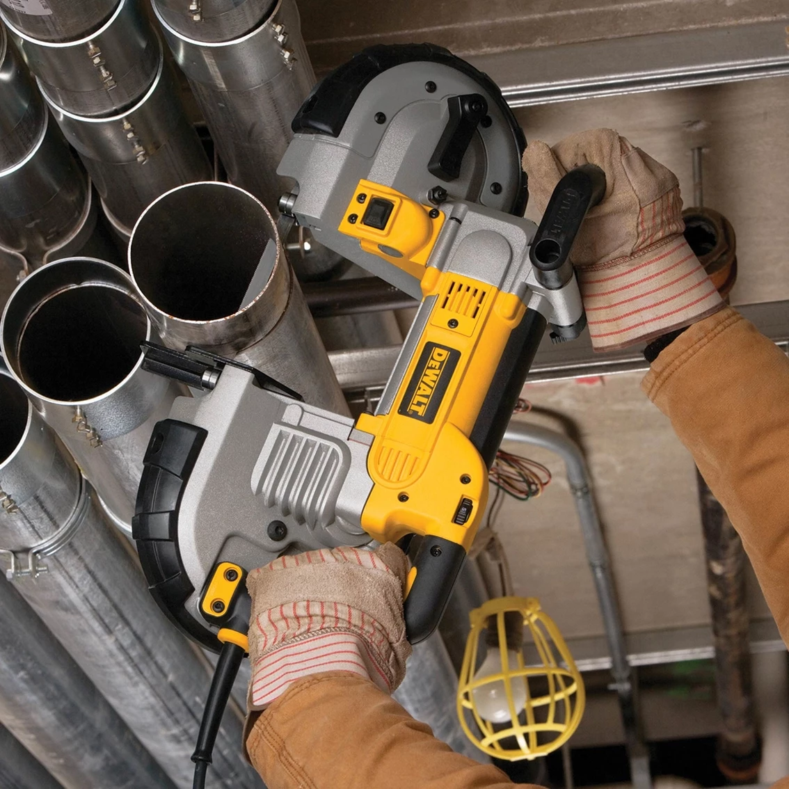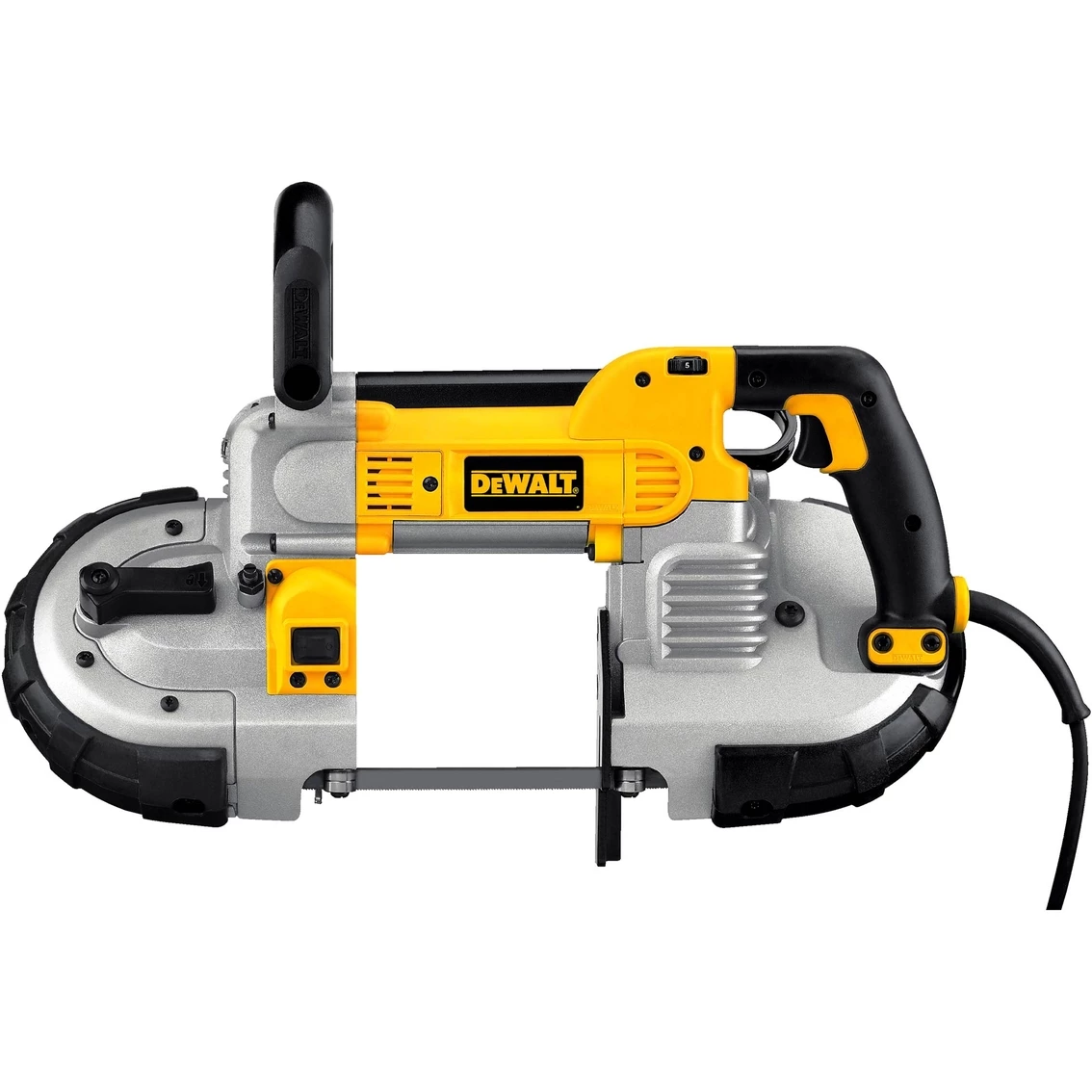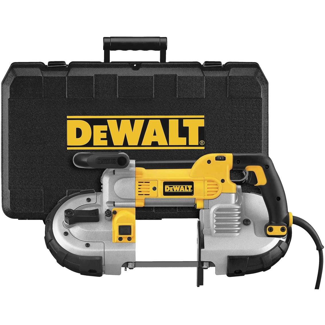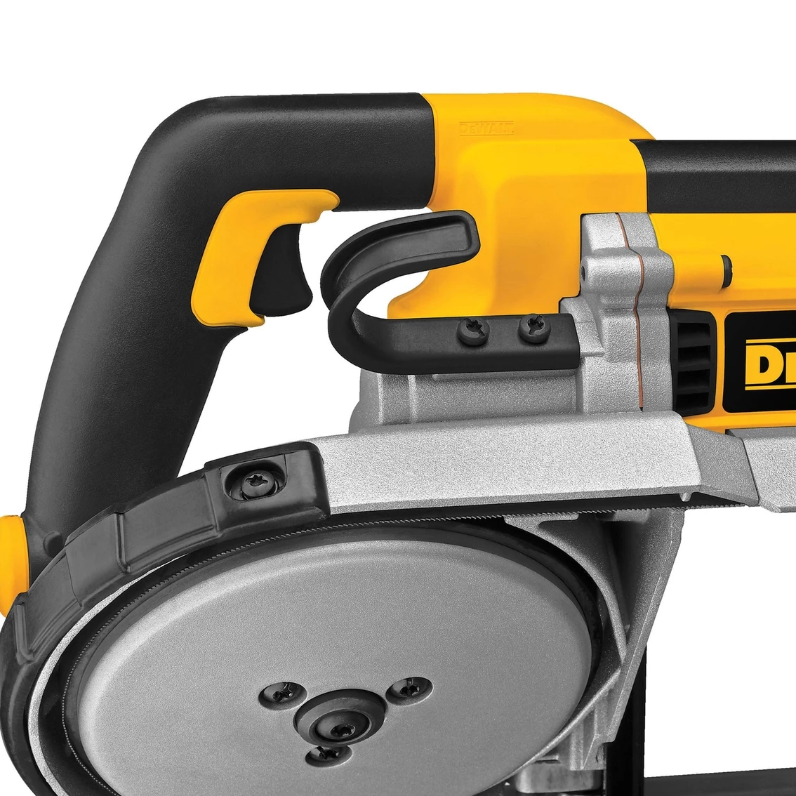The DeWalt DWM120 Deep Cut Band Saw has a powerful 10-amp motor for operating various jobsite applications and cutting rectangular stock up to 5 in. deep. A variable speed dial allows users to vary speed for specific materials and various applications. Serviceable steel shroud and rubber bumpers allow guards to withstand jobsite abuse without damage. The LED sight light allows the user to see the cut line in dark jobsite environments. An integrated hang hook allows user to hang the saw without damaging the front handle or castings. The multi-position adjustable large front handle offers the user plenty of hand space for a more accurate cut. Superior balance and ergonomics allows for more accurate cuts and less user fatigue. The blade tracking adjustment increases blade life by providing better blade tracking. Dual bearing blade guide rollers increase durability in the blade support system. Durable and adjustable material guide allows user to adjust for various jobsite materials. The ergonomic soft grip back handle provides comfort during use. Externally replaceable brushes allow for quick repairs on the jobsite. The blade changing lever loosens blade tension to allow for blade changes. Includes: Hex Wrench, standard 44-7/8 in. x 1/2 in. x .020 in. blade. Model: DWM120.