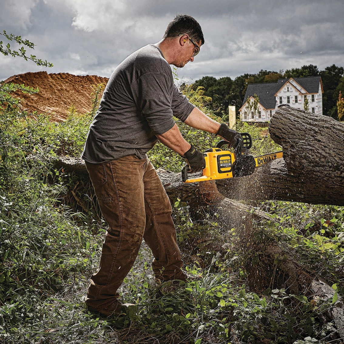 The DeWalt 60V Max Chainsaw features a low kick back 16 in. Oregon Bar and Chain for both construction and outdoor cutting applications. It’s tool-free chain tensioning and bar tightening knob enable proper bar clamping force. Auto-oiling provides continuous lubrication. Durable 60V Max FLEXVOLT battery powers 60V Max tools or it can be backwards compatible to work with 20V Max tools. Delivers up to 70 cuts per charge on a 6 in. x 6 in. pressure treated pine wood. Model: DCCS670X1.