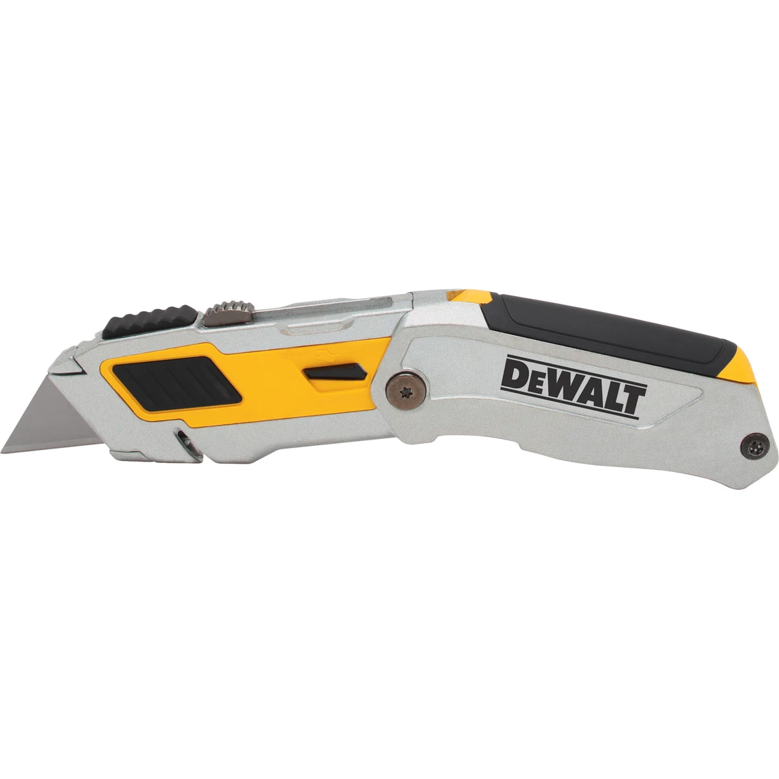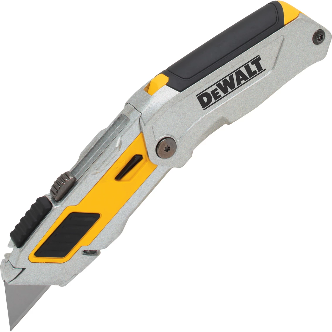 This Premium folding retractable utility knife has the blade security of a fixed knife with the convenience of a retractable knife. Easy blade changes with the simple press of a button. Integrated strap cutter. Blade storage in handle. Model: DWHT10296.