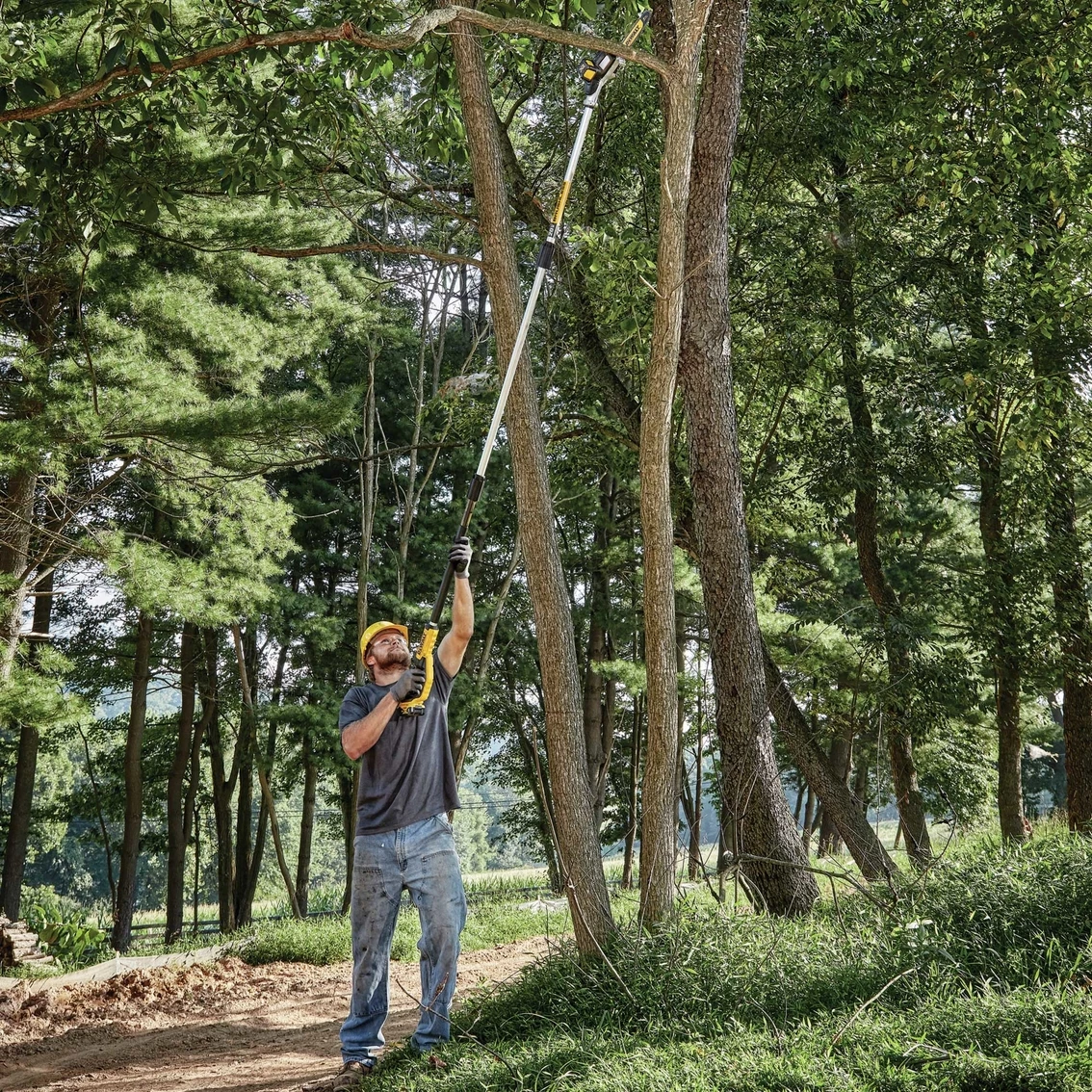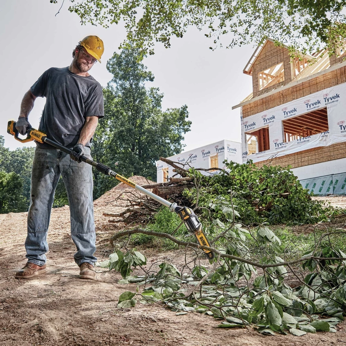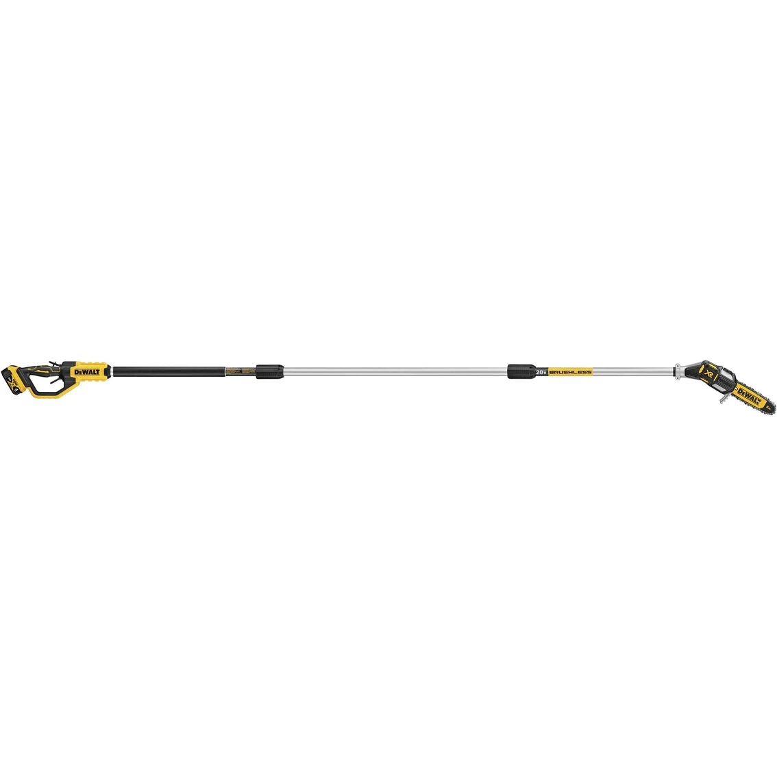 The DeWalt 20V MAX XR Brushless Cordless Pole Saw comes equipped with an 8 in. Bar and Chain to handle all of your pruning needs. It features a high-efficiency brushless motor that delivers up to 96 cuts per charge. The well balanced design and durable pole shaft extends up to 10 ft. for a total reach of 15 ft. It has an auto oiling feature for added convenience and time saving. Pole Saw also features metal bucking strips for a durable cutting grip and a tree hook that allows you to easily remove pruned branches.