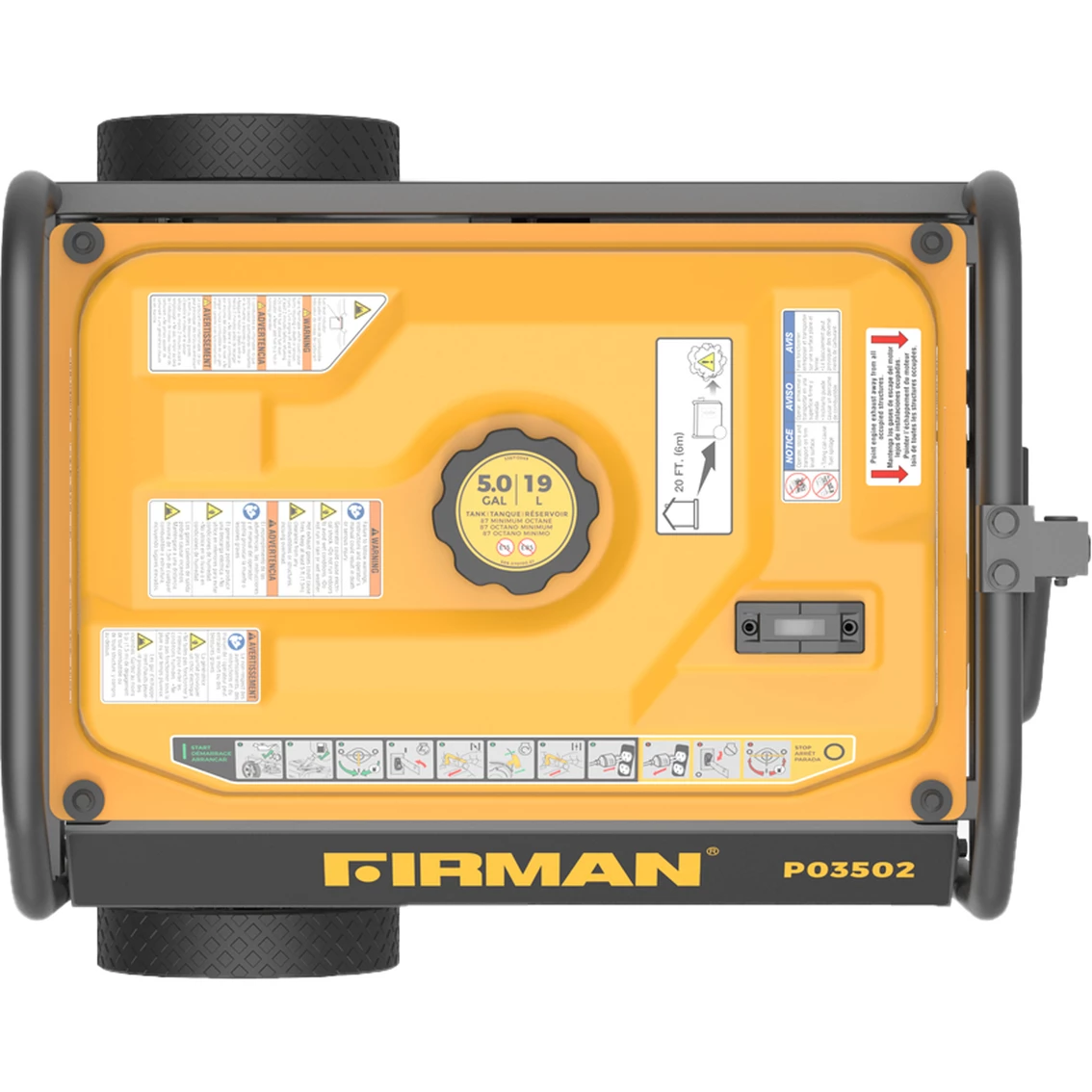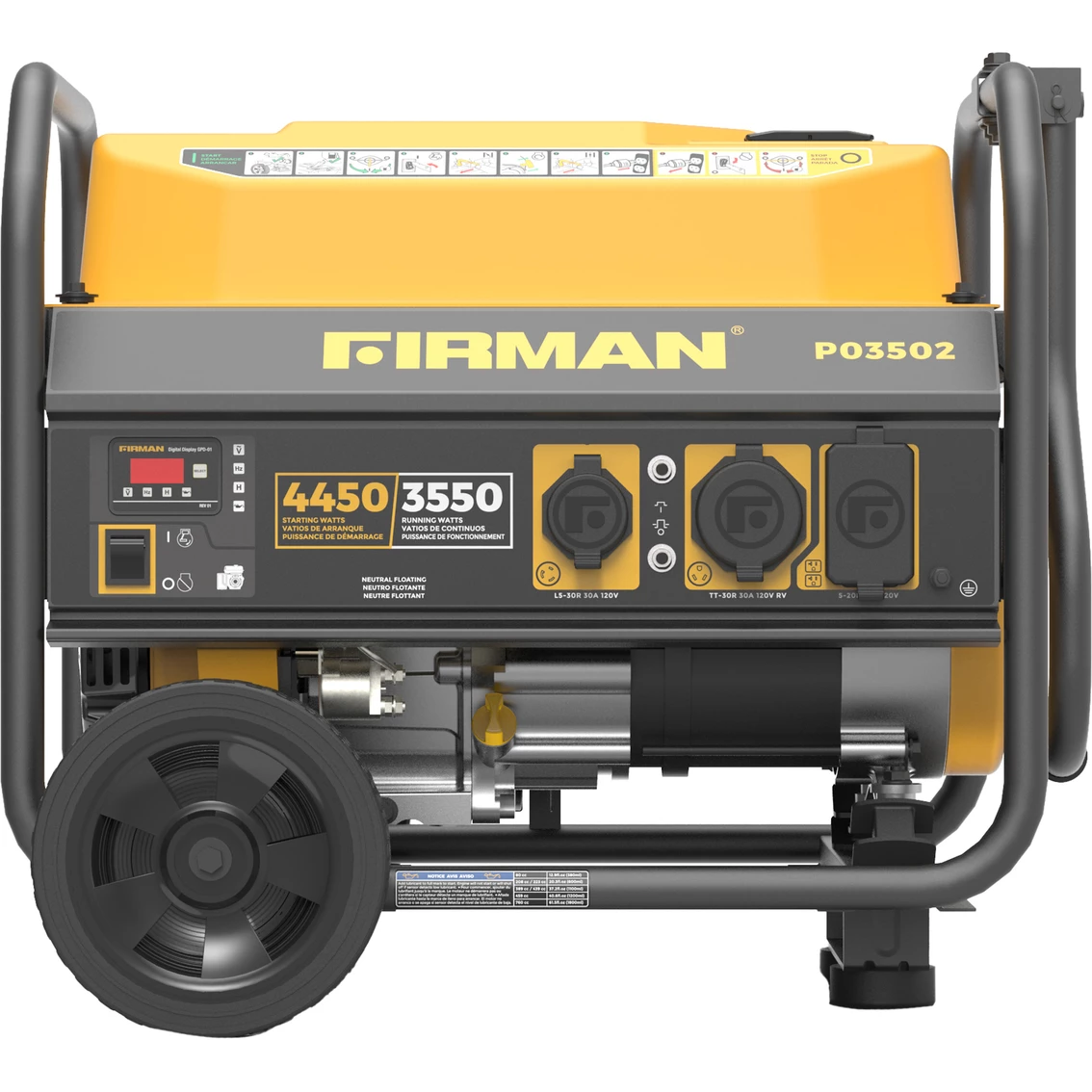The Firman Power Equipment FM P03602 Generator 3650w Performance Series features an open frame with 4550/3650 watts and is gas powered. Recoil, 5 gal tank, 14 hr run time, 4n1 data minder, 8″ HD wheels, folding handle, outlets (2) 5-20r 20a-12v, (1) tt-30r 30a-120v rv ready, (1) l5-30r 30a-120v twistlock. Model: P03602.