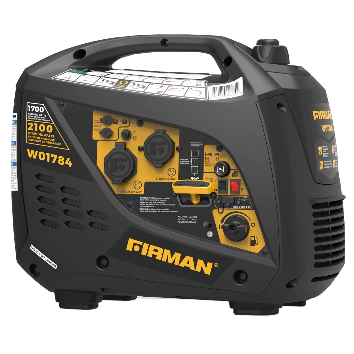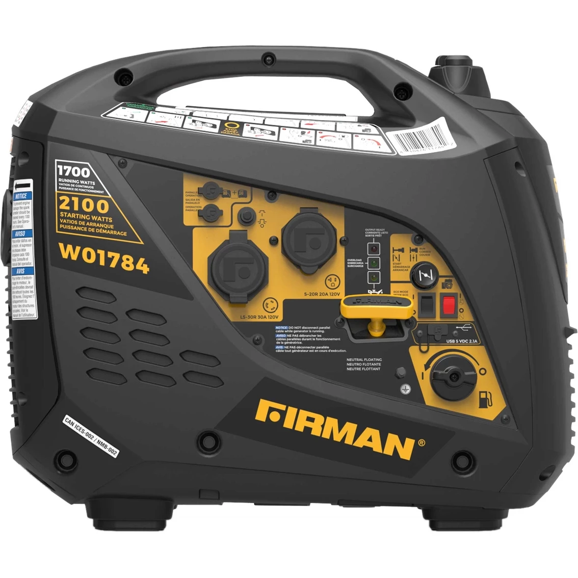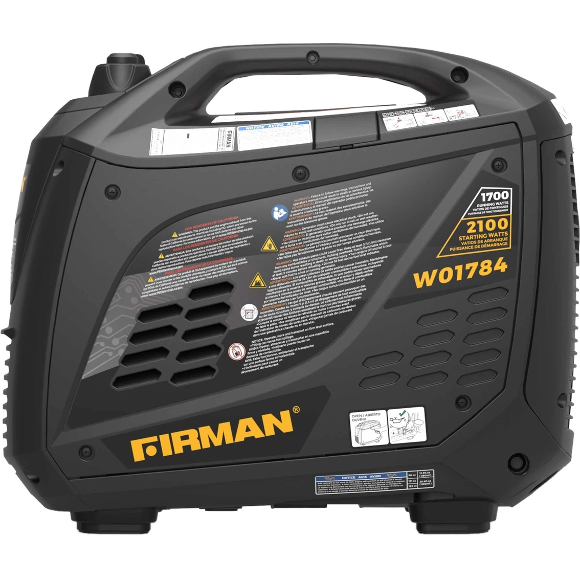 The Firman Power Equipment FM W01784 Inverter 1700w Whisper Series features a large tank and an extended run time. Fuel gauge, quiet muffler, multi feature control panel, outlet covers protecting from dirt dust and debris, clean power and California carb approved. Model: W01784.