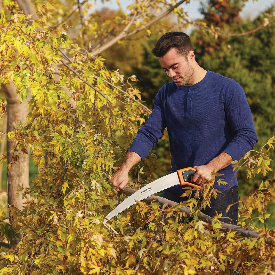Ideal for making quick, clean cuts through thick branches, the Power Tooth Softgrip D-handle Saw from Fiskars is a great choice for taking down thick tree limbs too large for a lopper. The power tooth blade with its triple-ground, razor-sharp teeth makes aggressive cuts to help you get through dense wood with speed and efficiency without sacrificing control. The fully hardened, precision-ground steel blade stays sharp longer than others, even through heavy use. You can even flip the saw for easy, controlled undercuts. The D-handle design with softgrip touchpoints provides a secure, comfortable grip no matter which way you hold the saw. Blade length: 18 in. Model: 393540-1008.