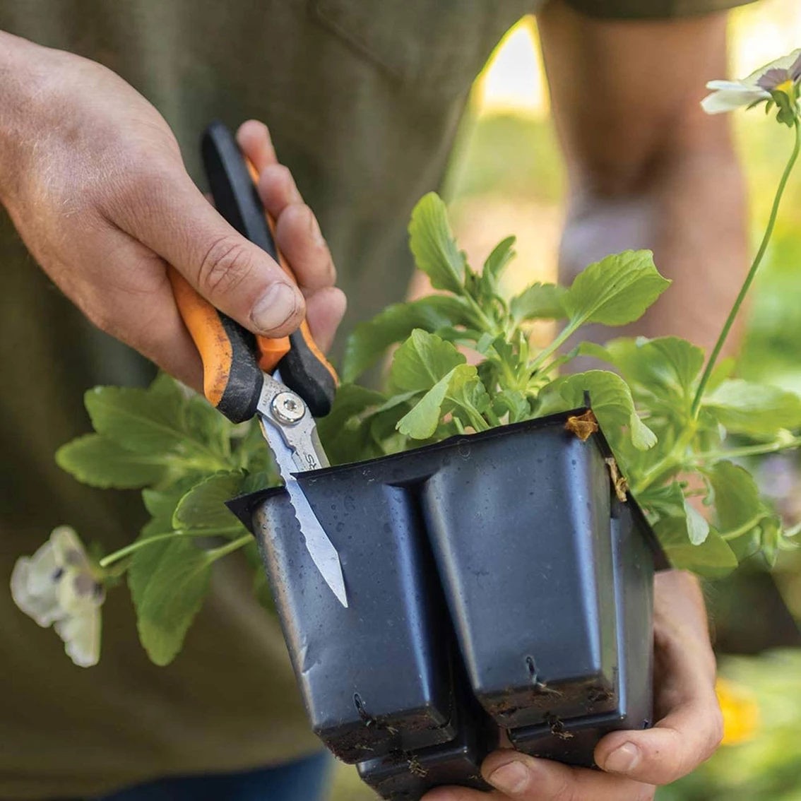 Easily slice open soil bags and cut Wire, netting, landscape fabric more With the multi-use blades of Fiskars multipurpose garden snips. From adding fertilizer to setting up trellises, prepping and maintaining a strong foundation is key to a healthy garden and can involve a variety of arduous tasks โ all of which rely on retaining blade sharpness. This versatile tool features fully hardened, precision-ground, stainless steel blades that cut all the way to the tip and stay sharp through heavy use. An outer, serrated edge is ideal for sawing twine or light rope, while the other straight edge cuts open boxes and bags with precision and ease. An integrated wire cutter also prevents blade damage. Additionally, an easy Action spring gently opens the blades after each cut to help reduce hand fatigue, while Softgrip touchpoints enhance comfort & control. An easy-open lock and rugged, nylon sheath with belt loop ensures reliable storage & portability.