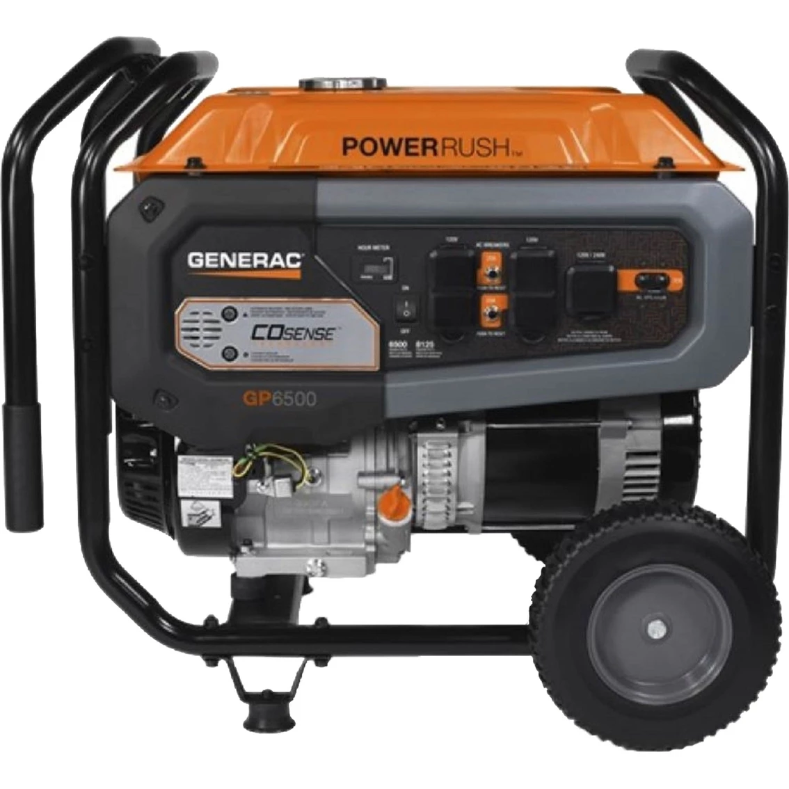 The Generac GP6500 COsense 389 PR Portable Generator with Cord offers powerful protection against hazardous carbon monoxide. Engineered to detect building amounts of CO faster than a household carbon monoxide monitor. COsense Technology stops, alerts, saves. Powerful protection from hazardous carbon monoxide. PowerRush Advanced Technology delivers 40% more starting capacity allowing you to do more with less. Generac’s OHV engine with splash lubrication provides a long engine life. Hour meter tracks maintenance intervals. Large-capacity steel fuel tank with incorporated fuel gauge provides durability and extended run times. Low-oil level shutdown automatically safeguards engine from damage. Covered outlets provides added protection from the environment and rugged working conditions. 1.25-inch steel tube cradle for added durability and strength. Fold-down, locking handle for sturdy portability and compact storage. Heavy-duty, never-flat wheels for reliable portability. Model: 7681.