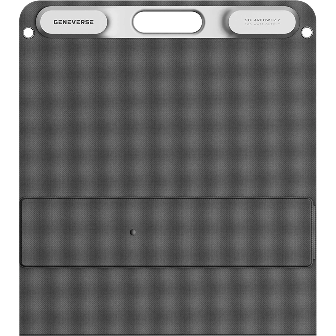 Each SolarPower 2 panel emits 200W of power for up to 800W power output with four panels, providing ultra-fast recharging for your Geneverse backup battery power station. Each SolarPower 2 panel consists of 64 Monocrystalline solar cells, offering 50% higher solar power conversion efficiency compared to traditional solar panels. The solar cells were invented in the USA. Portable, light-weight foldable design with an adjustable kickstand. It takes 30 seconds or less to set up and is ready to provide eco-friendly power supply in any emergency situation. IP67 waterproof rated: Dust-tight. No ingress of dust. Protection against the effects of immersion in water between 1cm and 1m (no greater than 3 feet) for 30 minutes. Industry-leading safety and reliability. Every solar panel undergoes 52 reliability and safety tests and is covered by a 5-year warranty. Model: 80-GVUS-SP2001.