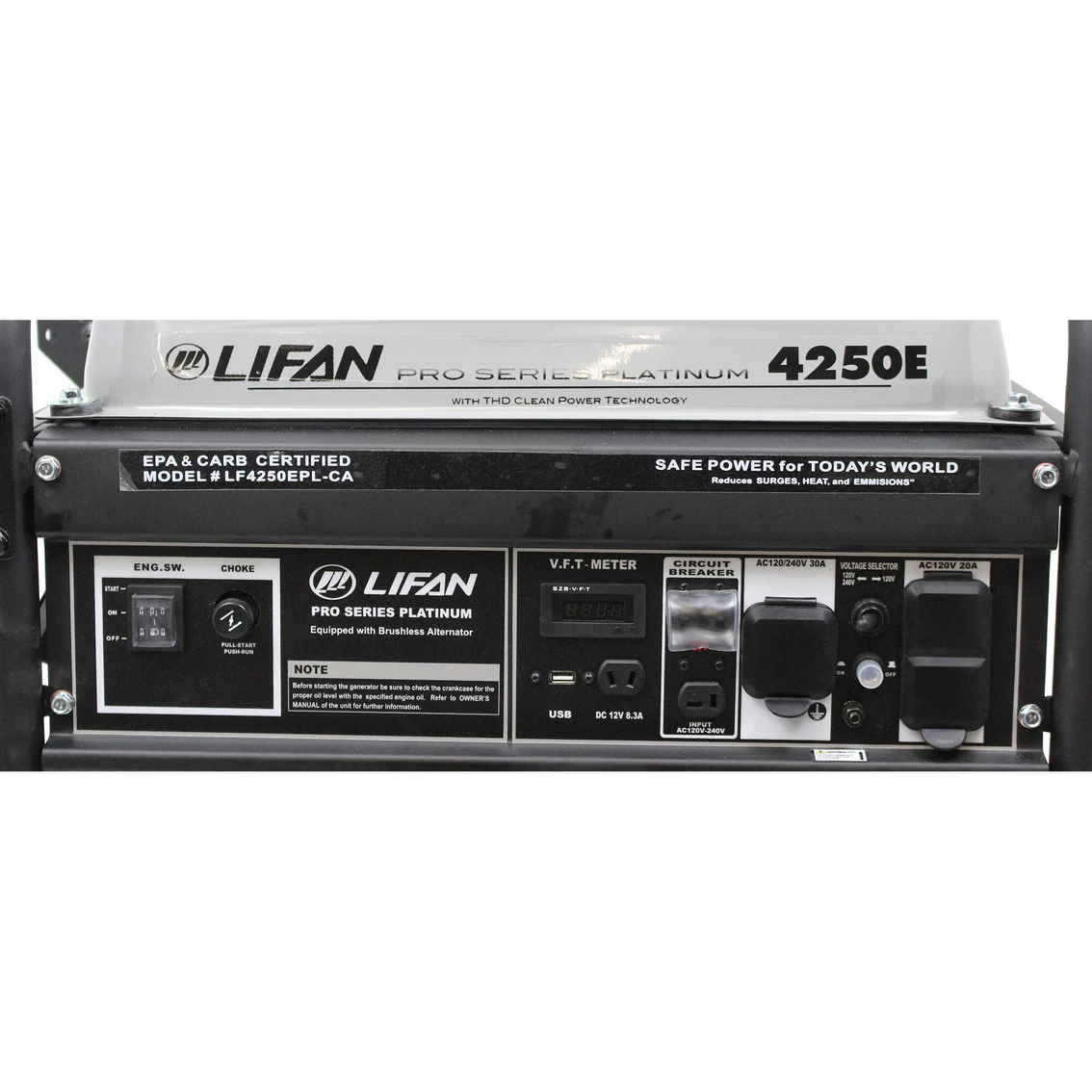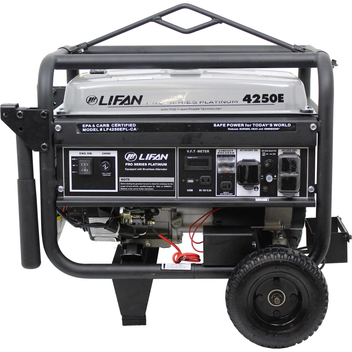 This Lifan Pro-Series 4000W LF4250EPL is part of the Premium OSHA Compliant, Rental/Contractor/Professional Platinum Series Generator. Developed to high quality standards, this generator comes equipped with a powerful 4 stroke OHV Industrial Grade engine, a heavy-duty 1.25 in. x 2mm thick round steel tube roll cage, a variety of outlets for variable power, and safety features to meet all Occupational Safety and Health Administration (OSHA) requirements. This commercial grade generator is a perfect fit for the Rental/Contractor Industry, emergencies, homeowners, Commercial/Residential job sites, special events, agricultural uses or any use requiring clean power to provide power for sensitive electronics. Generator is EPA Approved.