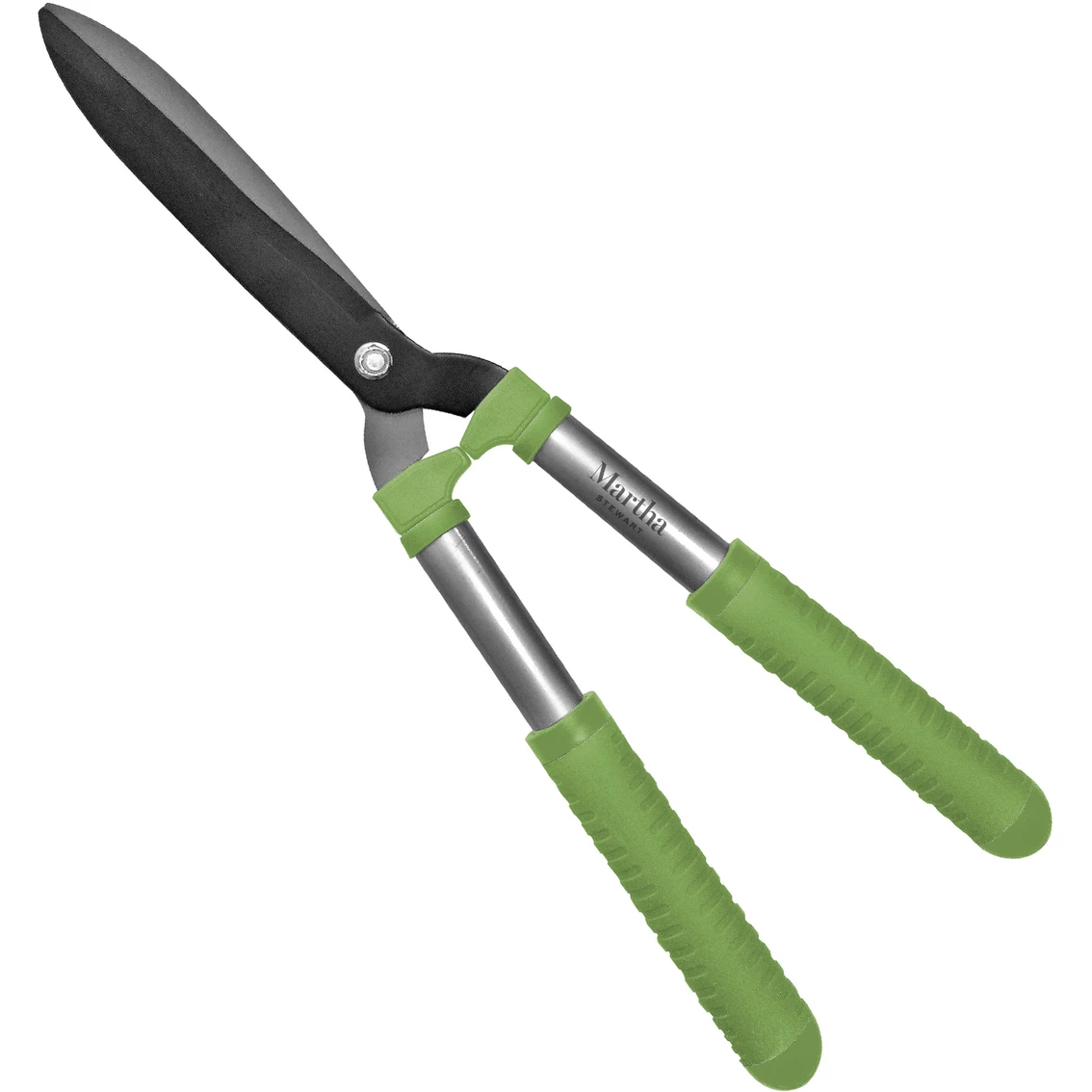 Edge Your Hedges! Only the finest can bring out your best. Hand selected by Martha Stewart and tested on her farm, the Garden Hedge Shears from the Martha Stewart Collection are the perfect addition to your gardening tool collection. The 9.6 in. carbon steel blades slice cleanly through twigs, stems and branches. Designed with ease of use in mind, Marthaβs hedge shears feature extra-long handles for comfort + control, and long, bypass-style blades for precision pruning of even the most delicate topiaries. Plus, the heavy-duty, rust-resistant construction is certain to last for years of continuous, reliable use. Choose the garden guruβs favorite and get equipped with the Martha Stewart Collection Long Handle Steel Garden Hedge Shears.