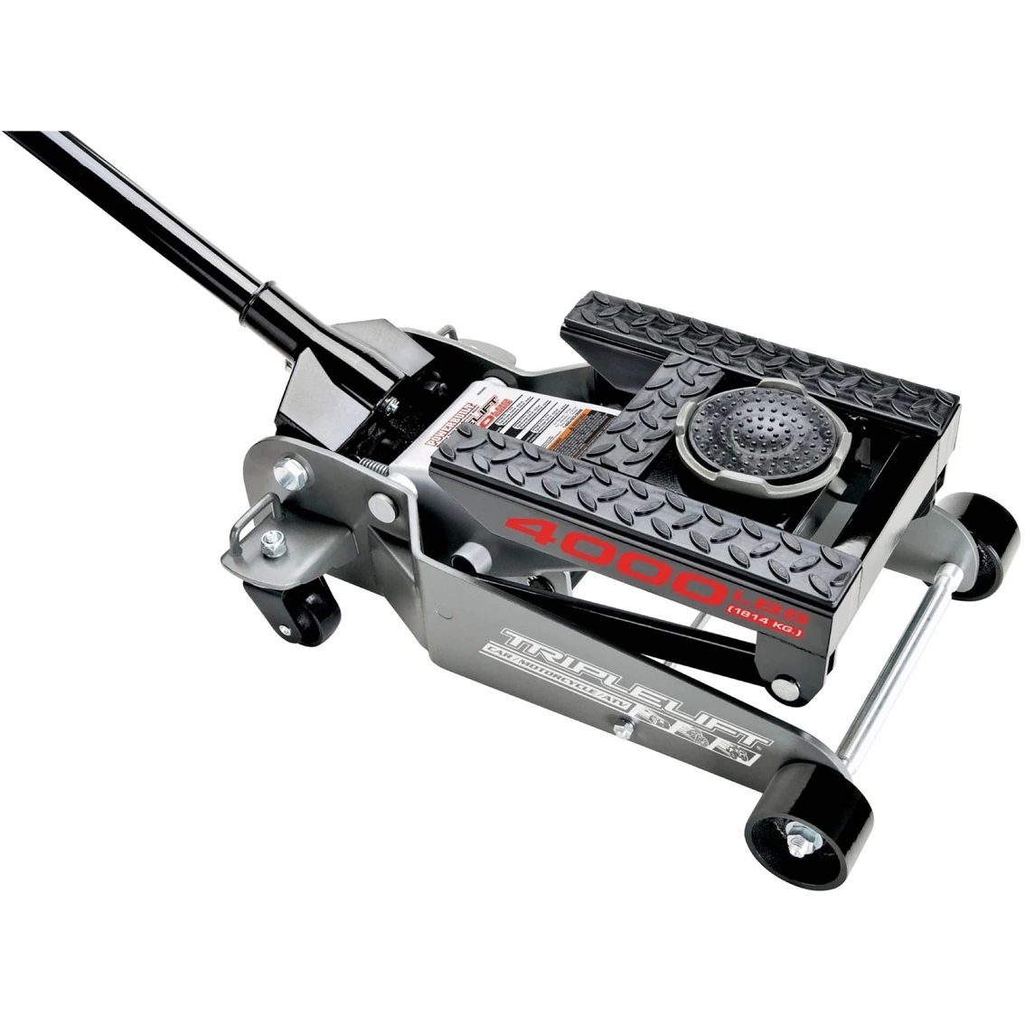 The Powerbuilt Triple Lift Jack slashes the expense and hassle of purchasing, maintaining and storing multiple jacks and jack stands. It’s the one jack that easily lifts almost anything with wheels and works on vehicle transmissions and differentials too. The secret to the Triple Lift is the patented design that features both a removable lift saddle and padded lift rails. This flexible design allows the Triple Lift to adapt to multiple types of vehicle frames. A locking safety bar holds the jack in place once the vehicle is raised, which eliminates the hassle of supporting a lifted vehicle with jackstands. Built-in tie-down loops make it easy to secure motorcycles in place for added stability.