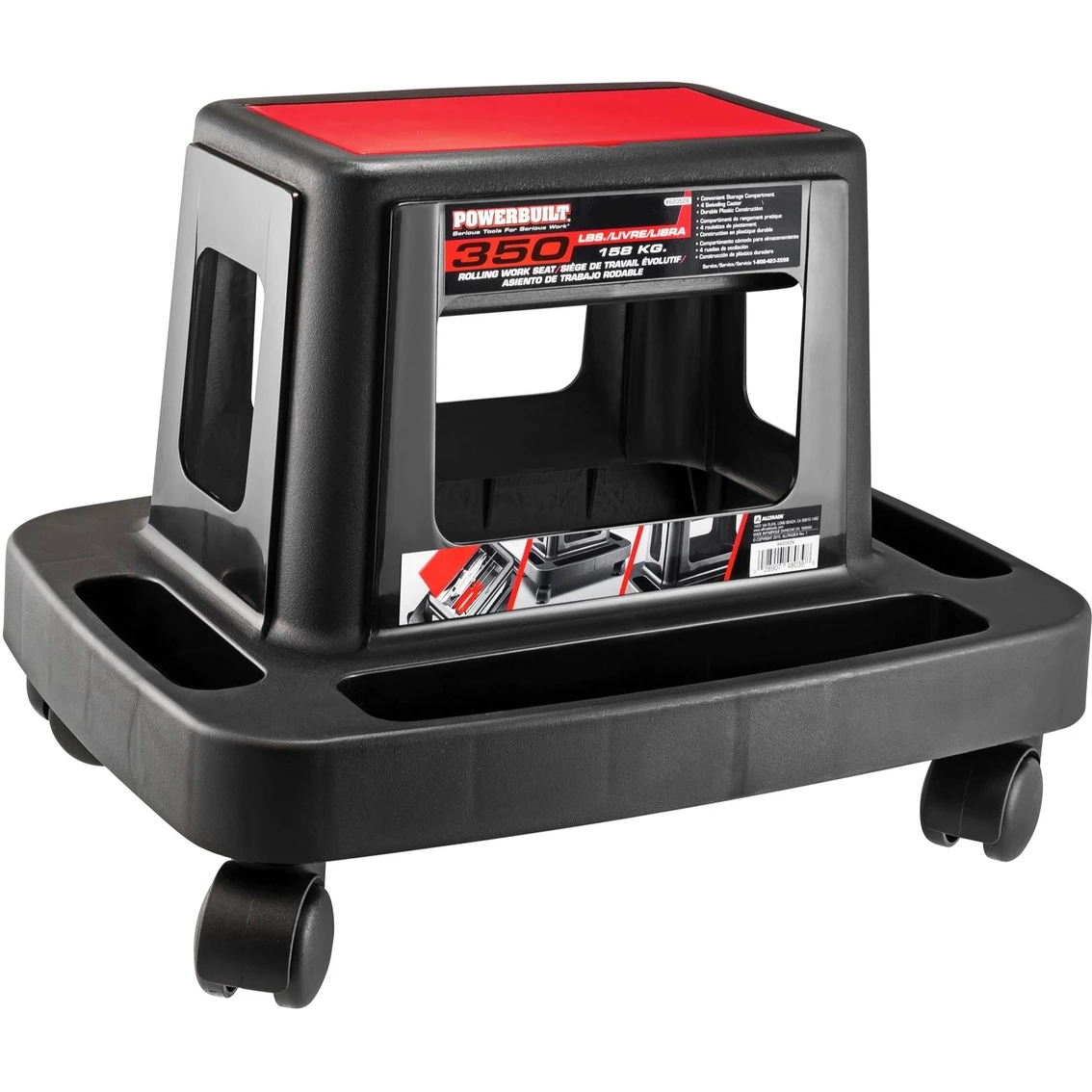 The Powerbuilt Rolling Work Seat has convenient storage compartments, 4 swivel casters, durable plastic construction and a capacity of 300 lb.