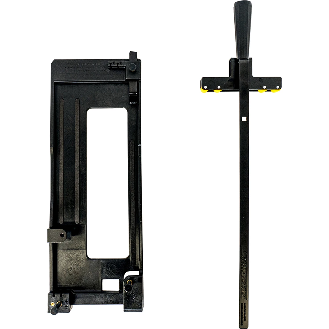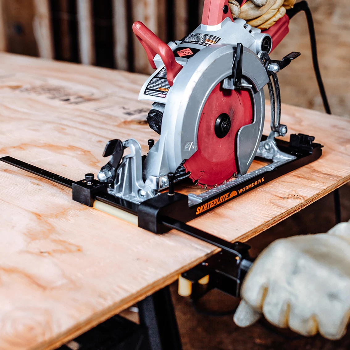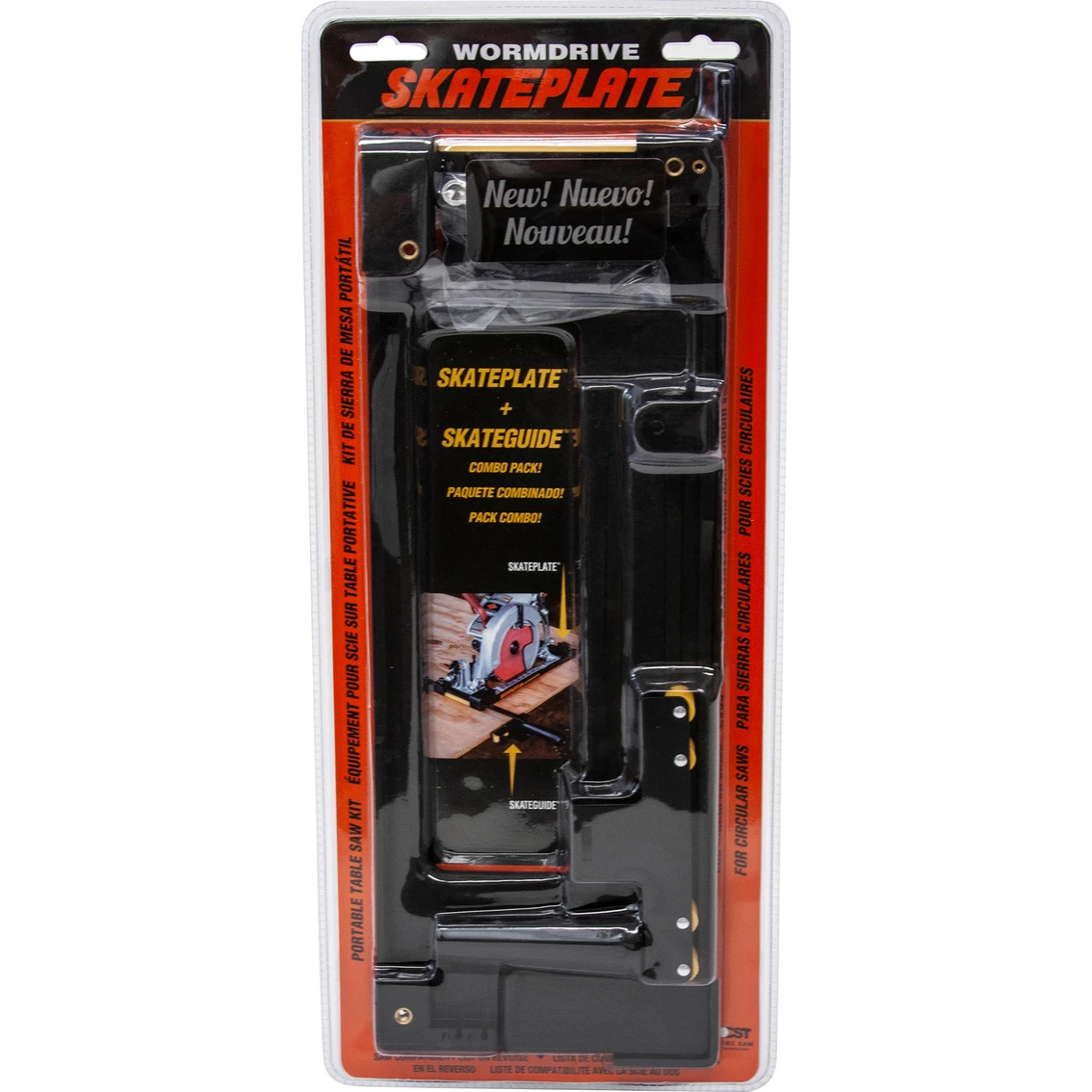 Rolling plate and cutting guide for left-blade circular saws. The SkatePlate & SkateGuide Combo Pack includes one SkatePlate, a removable rolling attachment for Left Bladed Worm Drive circular saws and one SkateGuide, an adjustable rolling cutting guide or rip fence. Used together, the SkatePlate and SkateGuide transform a circular saw into a portable table saw that glides across cutting surfaces, provides greater control and accuracy, saves time and money, eliminates friction and improves safety by reducing saw kickback. Make multiple, identical rip cuts in seconds. Model: CST002.