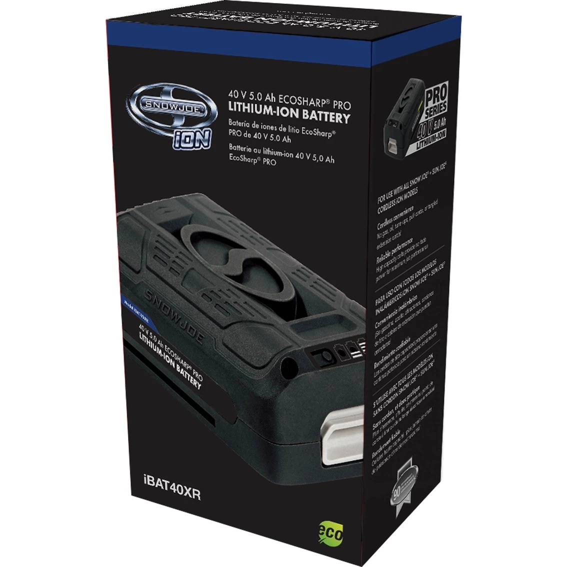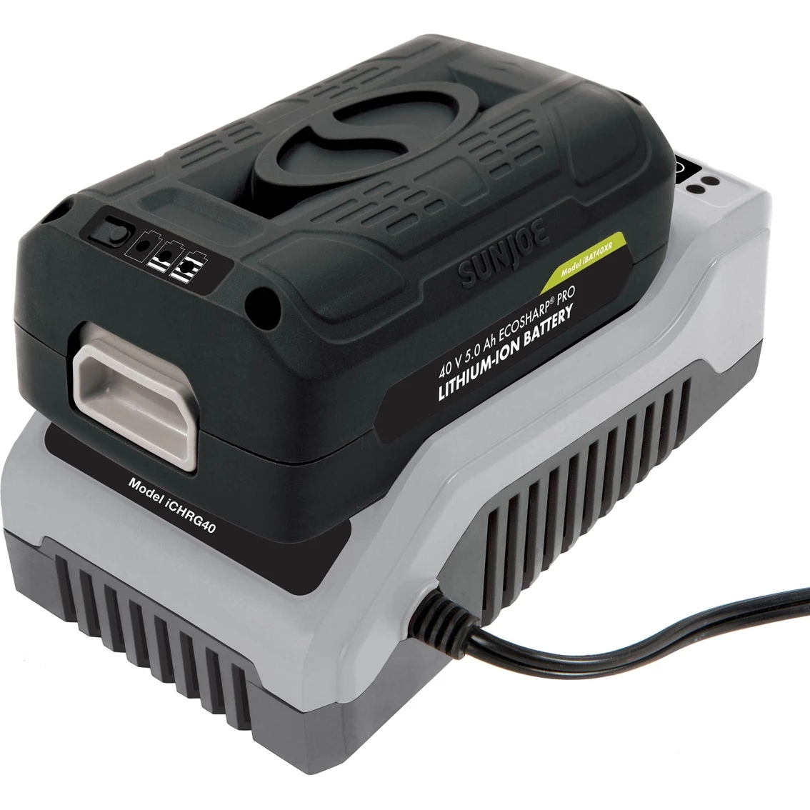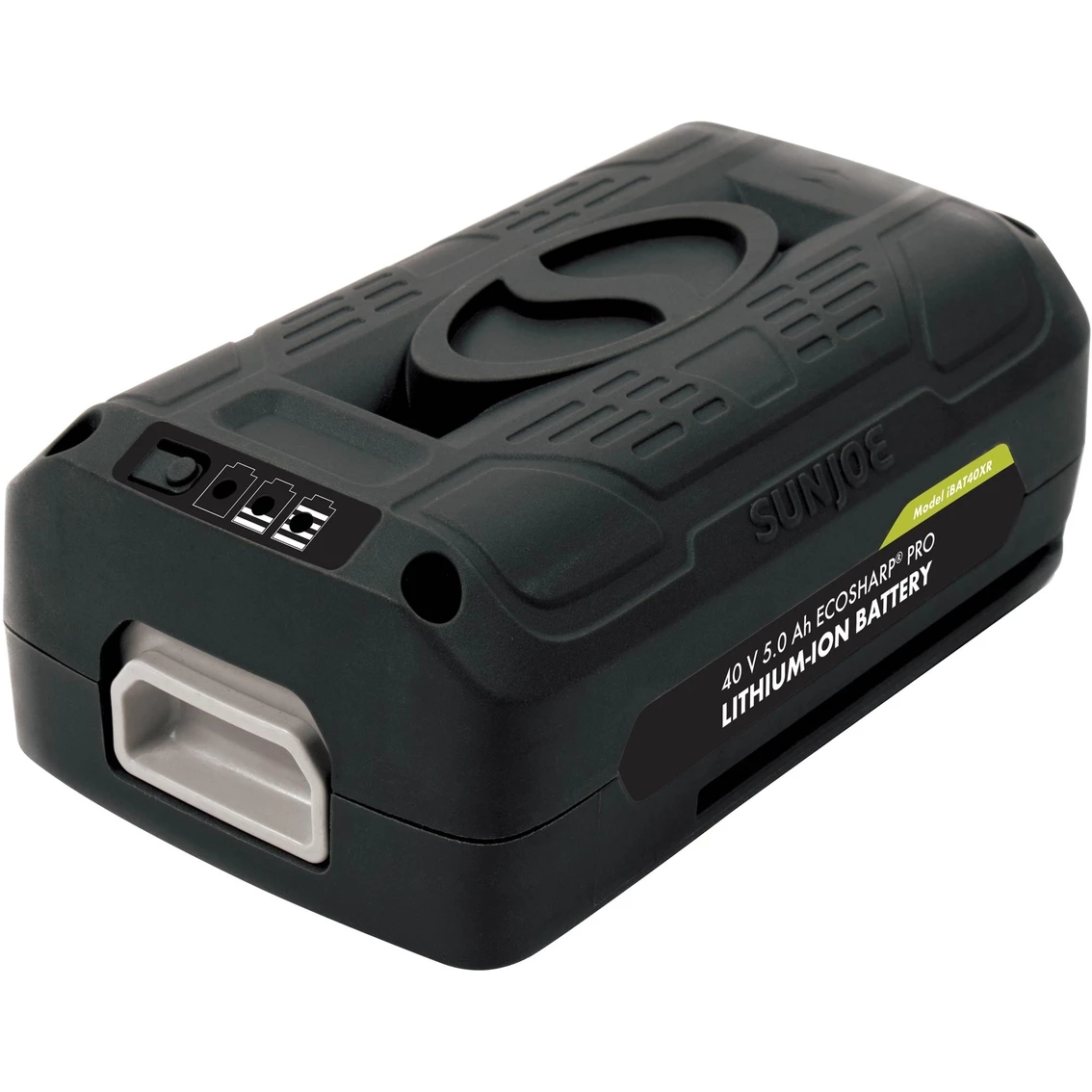 Power Up. Power your cordless iON tools the eco-friendly way with the 40-Volt EcoSharp PRO iBAT40XR lithium-ion battery. Compatible with all Snow Joe and Sun Joe iON models, the iBAT40XR features high capacity 5.0 Ah lithium-ion cells that deliver no-fade power for maximum job performance. Simply insert the EcoSharp PRO battery pack into your iON tool of choice and power up instantly without having to mess with gas, oil, pull-cords or tangled extension cords! Breathe easily and confidently while working with your iBAT40XR since this Energy Star-rated battery pack provides for cleaner, emission-free air during operation. Although run-times will vary depending on the tool used and the job performed, up to 65 minutes of whisper-quiet operation is a good approximation of what to expect from your iBAT40XR-powered tool. The fuel gauge indicator lights on the EcoSharp PRO will also let you easily monitor your battery’s charge capacity while it is in use. When it is time to charge, simply slide the iBAT40XR into its dedicated iCHRG40 charger. Just like your cell-phone battery, the iBAT40XR has no memory effect, so there is no need to drain the battery or wait for full charge before use. The iBAT40XR holds its charge well in storage and will retain up to 65% charge for six months. Easy, convenient, reliable, and super-lightweight (only 2.6 lb.), the 40-Volt EcoSharp PRO iBAT40XR is the smart way to battery pack for your power trip. Model: IBAT40XR.