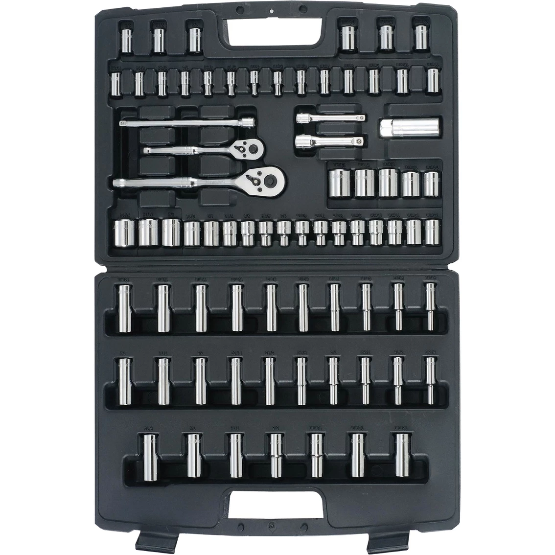 This 75 pc. Mechanic’s Tool Set by Stanley was designed for mechanics. These tools are forged from high-quality steel and finished in high-polish chrome for anti-corrosion protection. Stanley sockets feature the Max-Drive design, a unique radius corner design which provides 15% more torque to tighten fasteners easily and simplify the turning of rounded corners. They also help reduce fastener wear by minimizing contact on outer 5% of fastener helping increase life expectancy. All Stanley ratchets and sockets are manufactured globally, and are designed to meet or exceed ANSI specifications. Model: 96-010.
