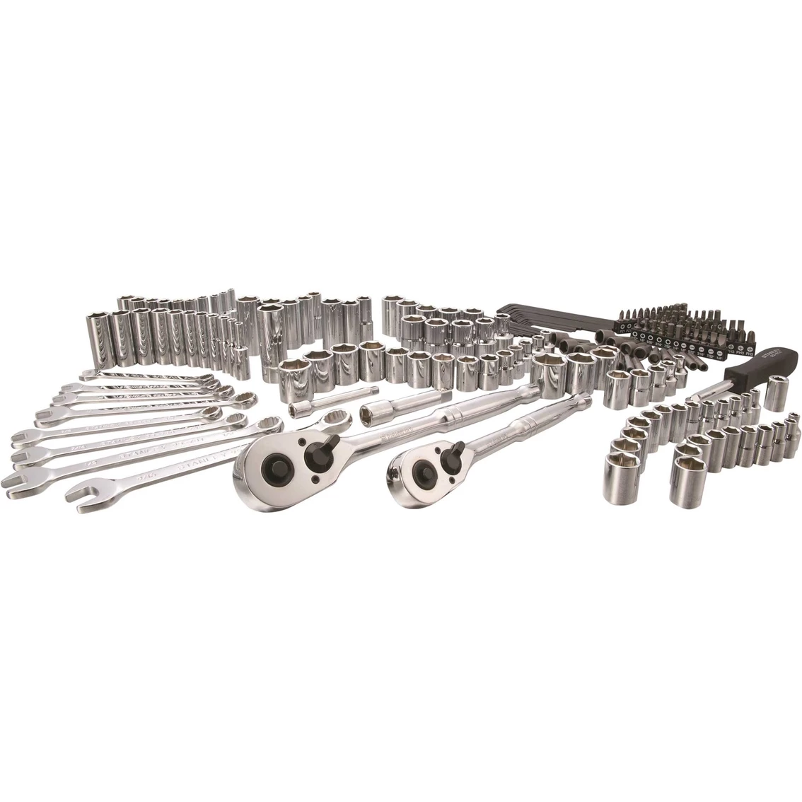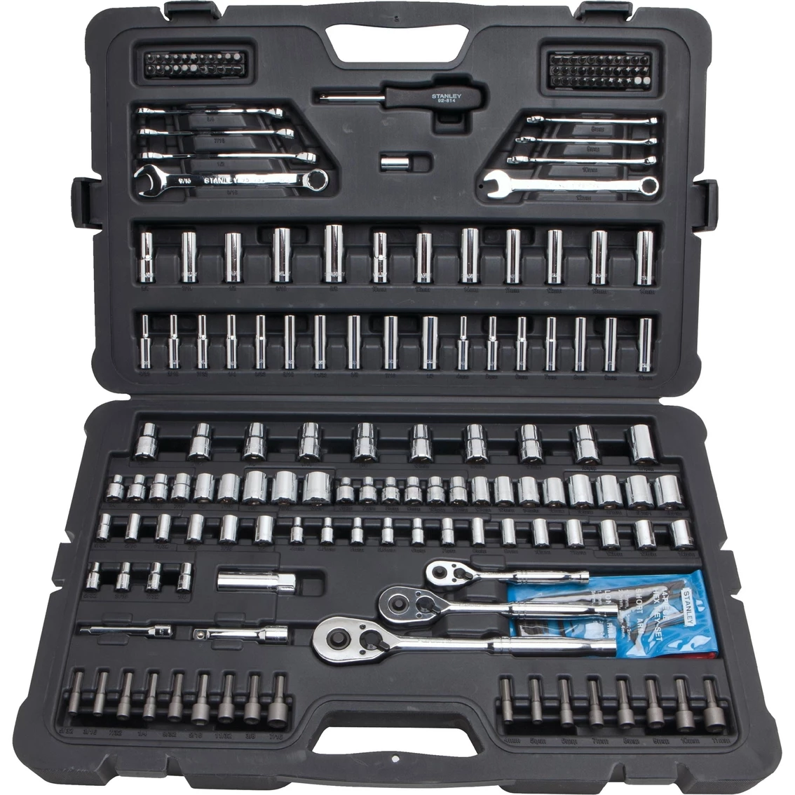 The Stanley Mechanics tool set is a complete tool set for mechanics that includes ratchets, extension bars, SAE and metric-sized sockets and nut bits, hex keys, combination wrenches and much more. Everything is housed in a rugged carry case. These tools are forged from high-quality steel and finished in high-polish chrome for anti-corrosion protection. They feature a quick release allowing users to remove extensions or sockets with one hand. All Stanley ratchets and sockets are manufactured globally, and are designed to meet or exceed ANSI specifications. Model: STMT71654.