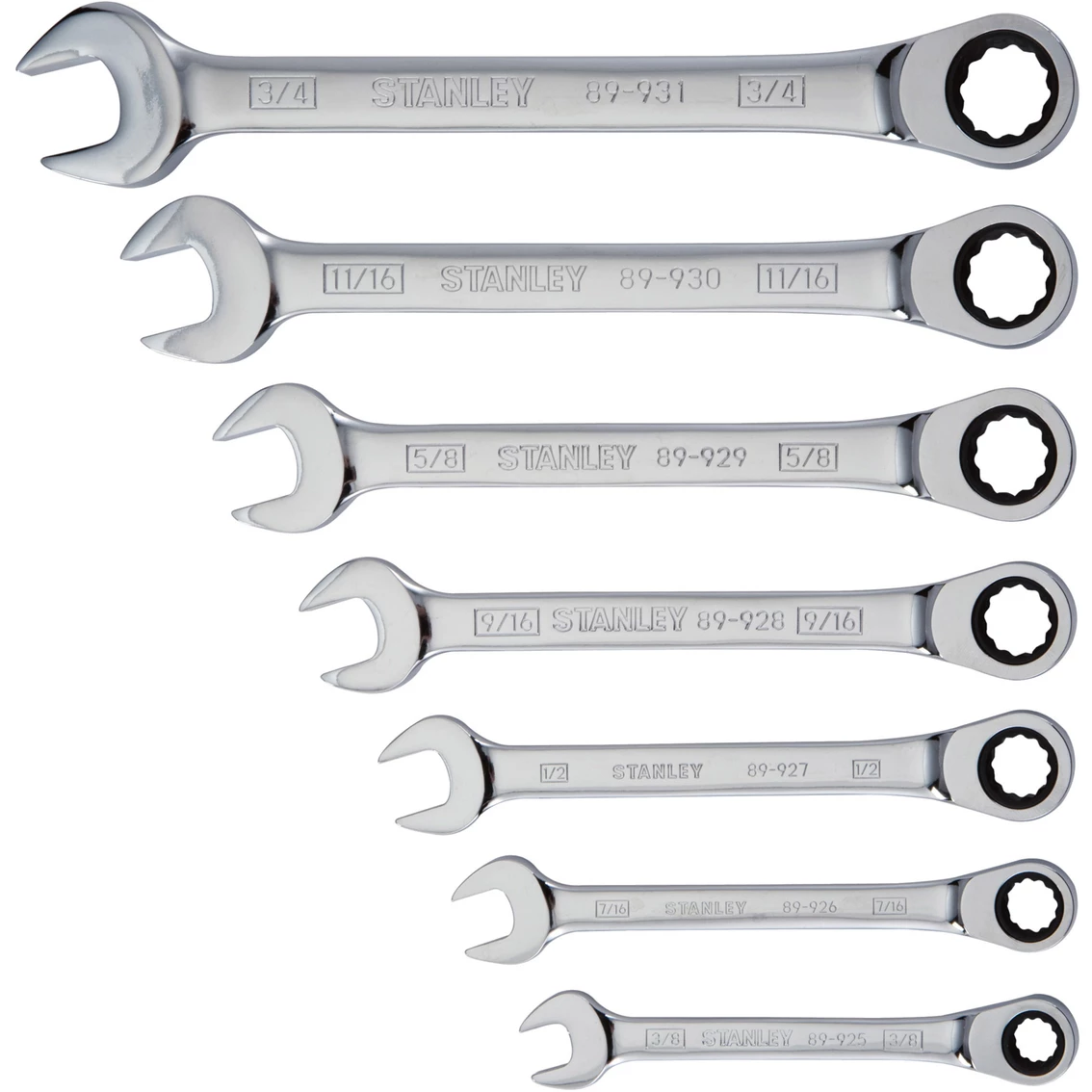 The Stanley 7 pc. ratcheting combination wrench set is slim and durable. Its MaxDrive design allows for up to 15% more torque, compared to standard wrenches, and helps reduce the risk of rounding and damaging fasteners. With its pivoting head that enables ratcheting function for fast operation, a thin profile to access tight spaces and body made of forged steel, these wrenches are precision machined to fit tightly onto fasteners. This set of tools is essentials for your tool or truck box.