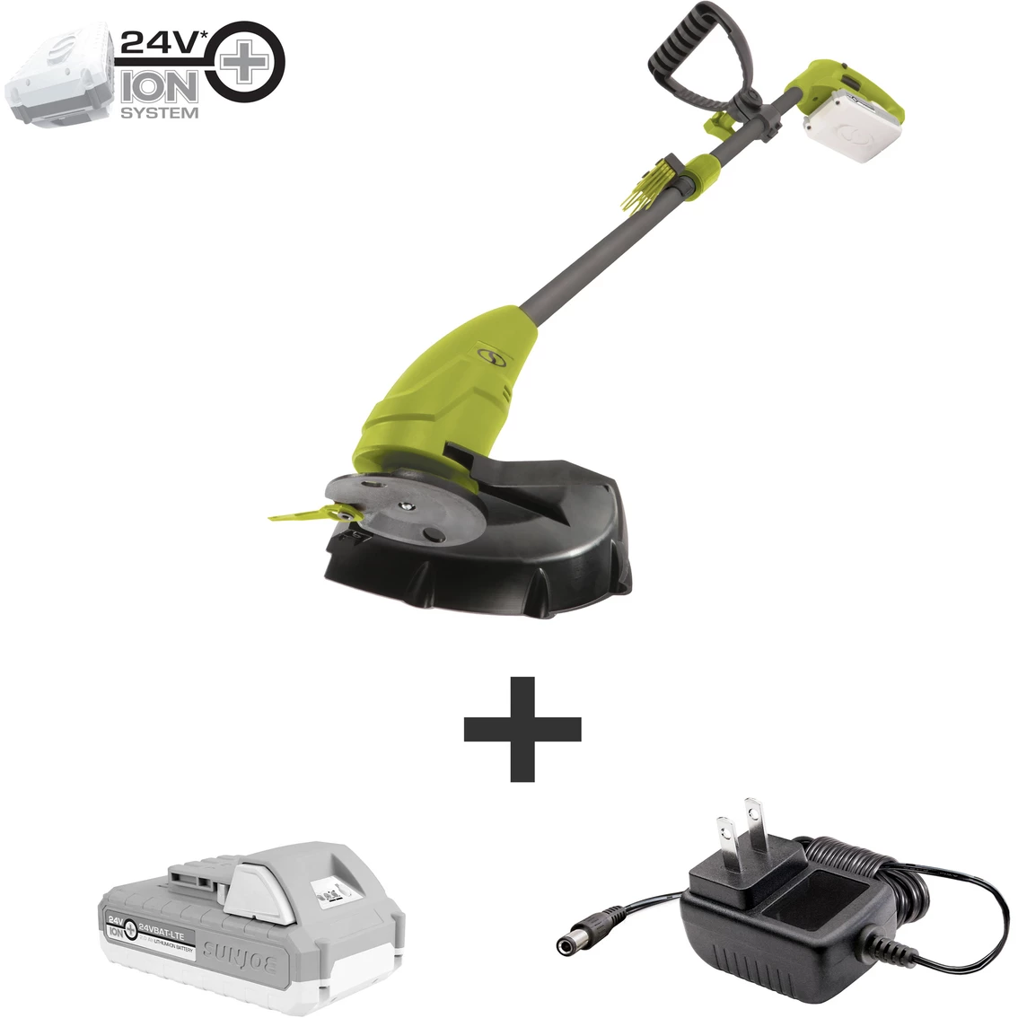 No Strings Attached. Say goodbye to tangled strings and extension cords with the next generation of grass-trimming tech: 24V-GT10-LTE 24-Volt 10-in. Cordless Grass Trimmer from Sun Joe. Powered by Sun Joe’s exclusive, eco-friendly iON+ lithium-ion battery system, 24V-GT10-LTE provides up to 1 hour and 25 minutes of reliable, rechargeable no-fade power performance in the yard and garden or wherever power is at a premium. No more struggling with string — Sun Joe features a revolutionary interchangeable grass blade system to deliver a crisp clean cut without the hassles and headaches of tangled trimmer line. The disposable nylon blade slices a path 10 inches wide through overgrown grass and unwanted weeds, and swaps out easily in seconds thanks to convenient onboard blade storage. Edge along flowerbeds, sidewalks, and walkways for a crisp, precise trim, every time. Ultra-lightweight at just 2 lb., Sun Joe features an adjustable auxiliary handle and telescopic shaft for maximum comfort and control. And every Sun Joe trimmer comes backed by a complete 2-year warranty, for worry-free performance, season after season. Avoid the hassle of a traditional trimmer and Go With Joe. Get Equipped. Model: 24V-GT10-LTE.