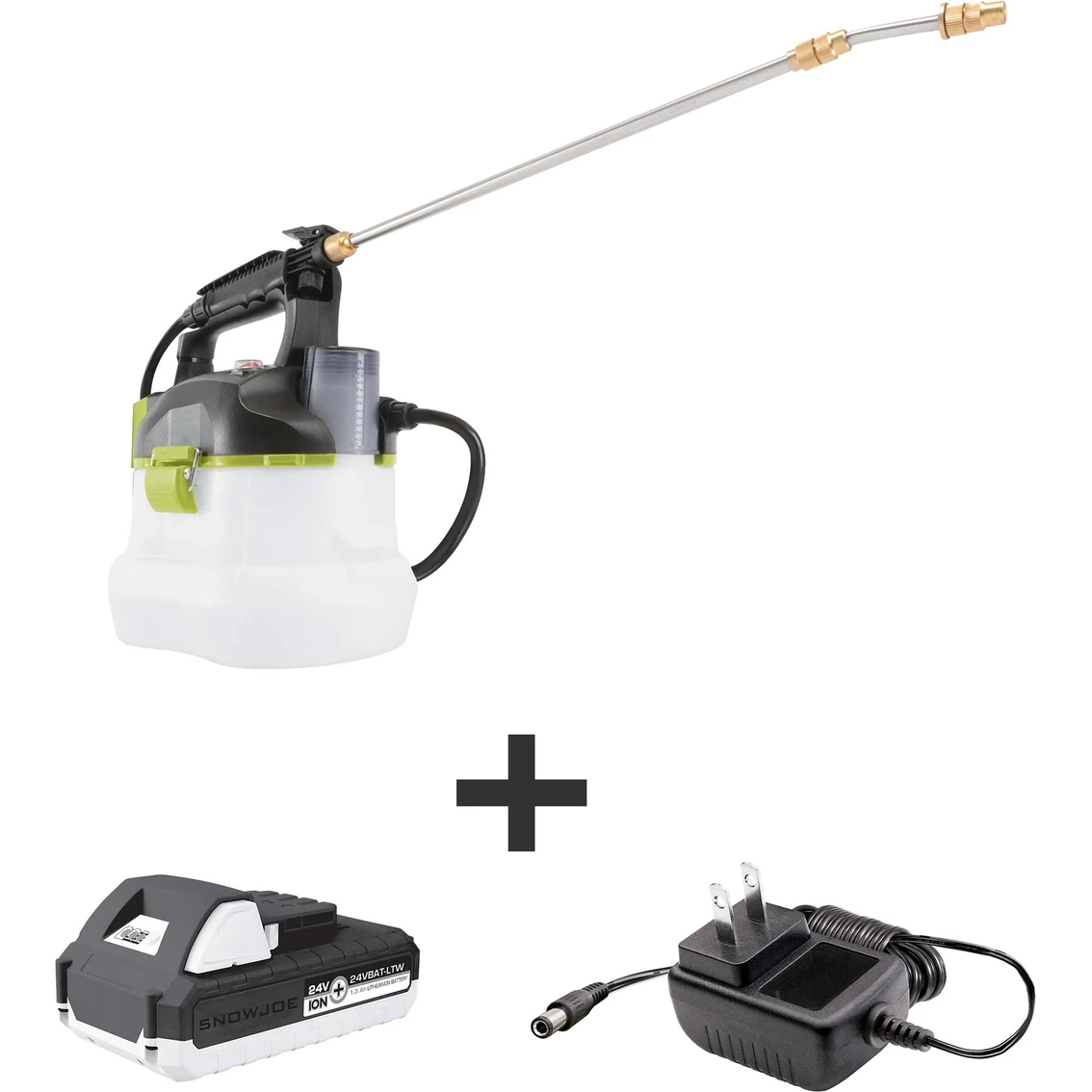Tailor Your Spray. Spray away unwanted weeds and garden pests with the perfectly portable 24-Volt iON+ Cordless Multi-Purpose Chemical Sprayer from Sun Joe. Keep your yard neat and healthy in less time with the cordless convenience of iON+ — the eco-friendly lithium-ion battery system from Sun Joe. Powered by exclusive EcoSharp technology, 24V-GS-LTW’s included 1.3-Ah battery offers up to 10 hours of rechargeable runtime! The powerful 10-watt motor sprays up to 95 gallons of your chemical of choice per charge — that’s 20.3 oz. per minute — to quickly clear away pests, weeds, treat plant disease, or even apply liquid fertilizer — with no pumping required! The removable translucent tank holds up to 1 gallon of chemical solution and comes equipped with an onboard, 4 fl. oz. measuring cup to perfectly portion your mixture. The telescopic spray wand extends from 17.7 in. to 28.7 in., to evenly distribute chemical spray over large areas, apply in tight spaces, or reach down low to tackle plant diseases or pests right at the roots. Customize your chemical application — use a concentrated spray for precise plant treatment, or cover large areas with a fine mist and just a twist of the adjustable brass nozzle! Plus, the sturdy carrying handle, lightweight design and cord-free convenience makes Sun Joe easy to tote around your yard and garden, or anywhere power is at a premium. And when the job is done, simply clean out the tank and spray gun for years of continuous use. So, fight back against pests and weeds and Get Equipped with the 24-Volt iON+ Cordless Multi-Purpose Chemical Sprayer from Sun Joe. Model: 24V-GS-LTW.