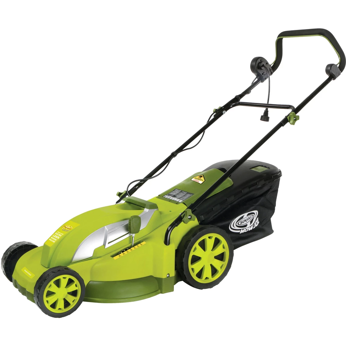 Lawn cleanup just got easier with the Sun Joe Mow Joe 17-inch 13-amp electric lawn mower/mulcher MJ403E. No more messy gas, oil or toxic carbon emissions! Just power up your eco-friendly Mow Joe with the push of a button and watch its powerful 13-amp motor mow a 17-inch wide path in a single pass. Easily tailor the grass cutting height from 0.98 to 2.87 inches using the 7-position height adjustment lever. Weighing only 31.5 lb. with sturdy front and rear wheels to enhance its maneuverability, Mow Joe cruises through your lawn leaving behind 17-inch trails of groomed green.