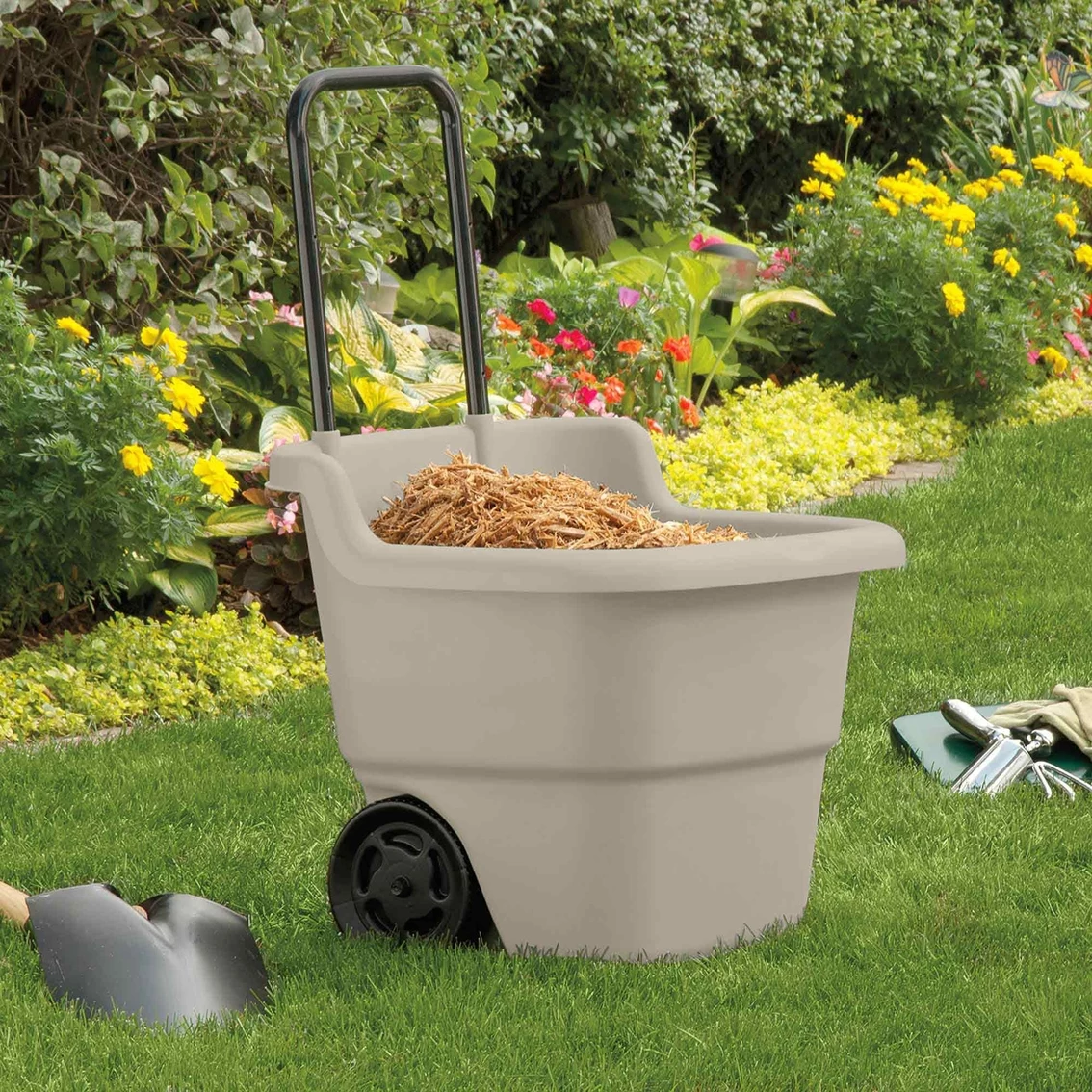 Suncast’s portable lawn cart is the perfect solution to storing and transporting mulch, dirt and much more. This cart is made of durable weather resistant resin that is lightweight and easy to use and transport. The telescoping handle allows you to adjust the handle height for ease of use and maneuverability. Telescoping handle for easy use; 7 in. wheels with metal axles. Assembly required. Capacity: 15 gal. or 150 lb. Model: LC1250D.